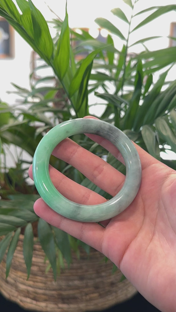 * DETAILS--- This bangle is crafted from genuine Burmese Jadeite jade in a vibrant, apple green and a beautiful dark WuJi (乌鸡) "black chicken" a blackish grey tone. With its captivating color, it radiates a timeless elegance and cultural heritage. It's a full round, traditional bangle, which is fully round throughout the bangle and this bangle features a wider width making this a more unique and bold bangle. Known for its durability, jadeite is also believed to bring good luck. This bangle makes a thoughtful and meaningful gift for yourself or someone special.