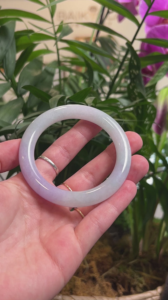 * DETAILS--- This bangle is crafted from genuine Burmese Jadeite jade. It features a "Vixen" purple-lavender 妖紫 color on part of the bangle and a white color on the other with vivid green patches. The jade texture is smooth and semi translucent with no natural lines and minimal cloudy spots. It's a full round, traditional bangle, which is fully round throughout the bangle. Known for its durability, jadeite is also believed to bring good luck. This bangle makes a thoughtful and meaningful gift for yourself or someone special.