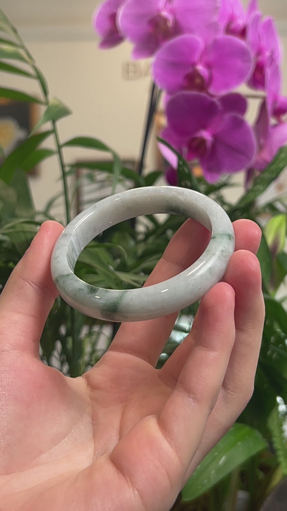 *DETAILS--- This bangle is crafted from genuine Burmese Jadeite jade that features a a white-green base color with deep green flowers throughout. The texture is semi-smooth and translucent with some natural lines and minimal cloudy spots that reflect the jade's genuine character. Designed in a half-round, comfort-fit style, the bangle is flat on the inside for a comfortable feel, perfect for everyday wear. Known for its durability, jadeite is also cherished as a symbol of good luck, protection, and harmony. Whether as a gift for yourself or a loved one, this jade bangle is a meaningful treasure that combines natural beauty, lasting craftsmanship, and exceptional value to cherish for years to come.