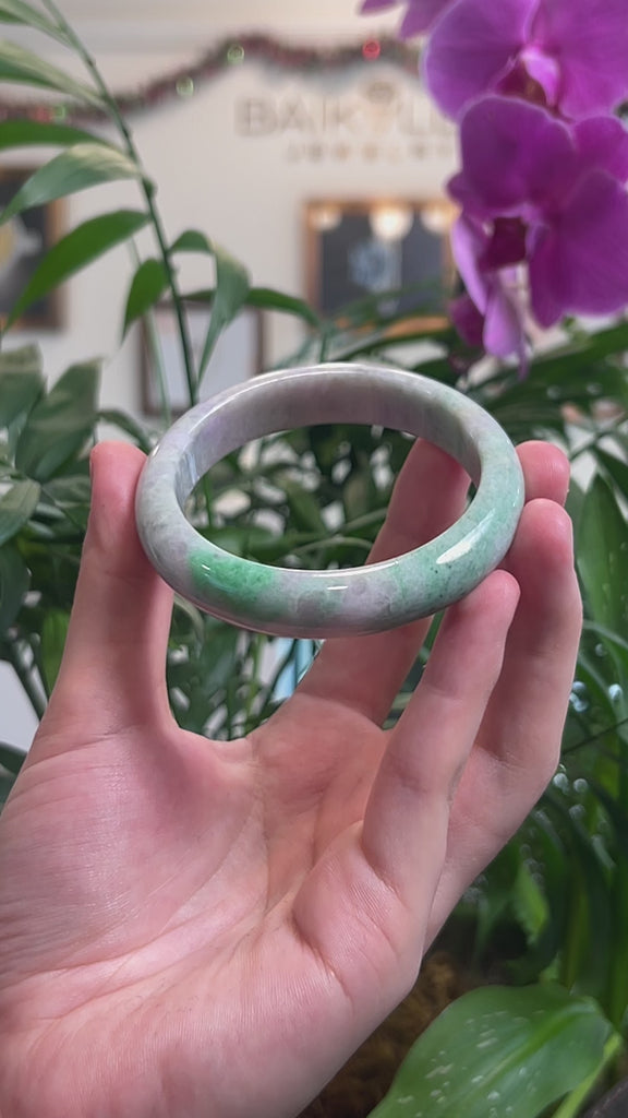 * DETAILS--- This bangle is crafted from natural Burmese Jadeite jade that features a a white-lavender base color with large patches of vibrant green throughout. The texture is semi-smooth and semi-translucent with some natural lines and cloudy spots.