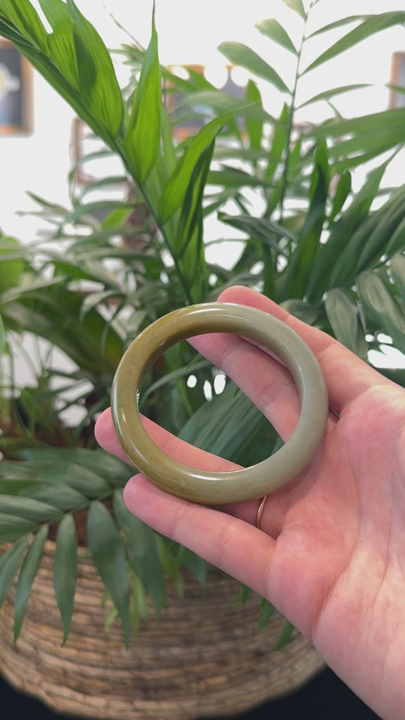 * DETAILS--- This bangle is crafted from genuine Burmese Jadeite jade. It features a semi smooth, semi translucent texture with rich green and honey yellow colors. It's a half round, comfort-fit bangle, which is flat on the inside of the bangle and comfortable for everyday wear. Known for its durability, jadeite is also believed to bring good luck. This bangle makes a thoughtful and meaningful gift for yourself or someone special.