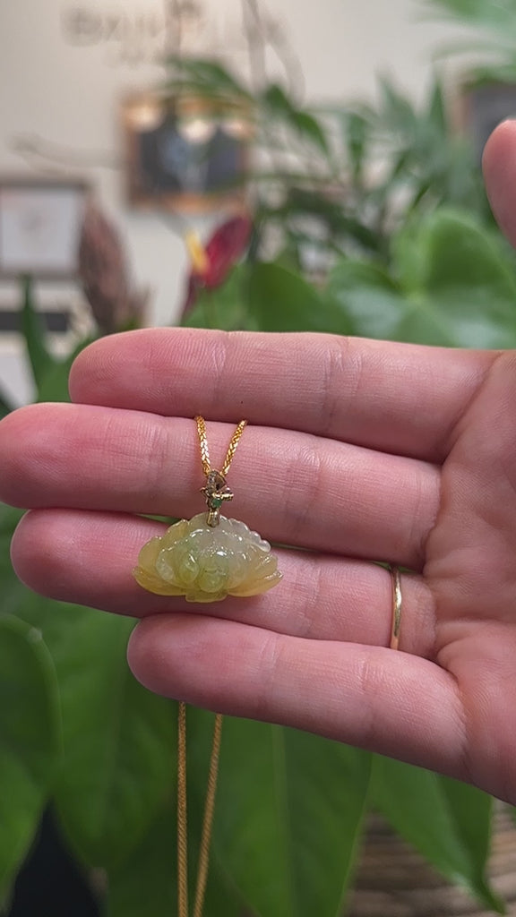 * Design Concept--- This pendant is crafted from high-quality, genuine Burmese yellow-green jadeite jade, carved into an elegant lotus design. The jade features a smooth, translucent icy texture that highlights its natural beauty. It’s finished with a solid 18K yellow gold bail in a delicate butterfly theme, accented with sparkling diamonds and imperial jade. A beautiful and meaningful gift for yourself or someone special.
