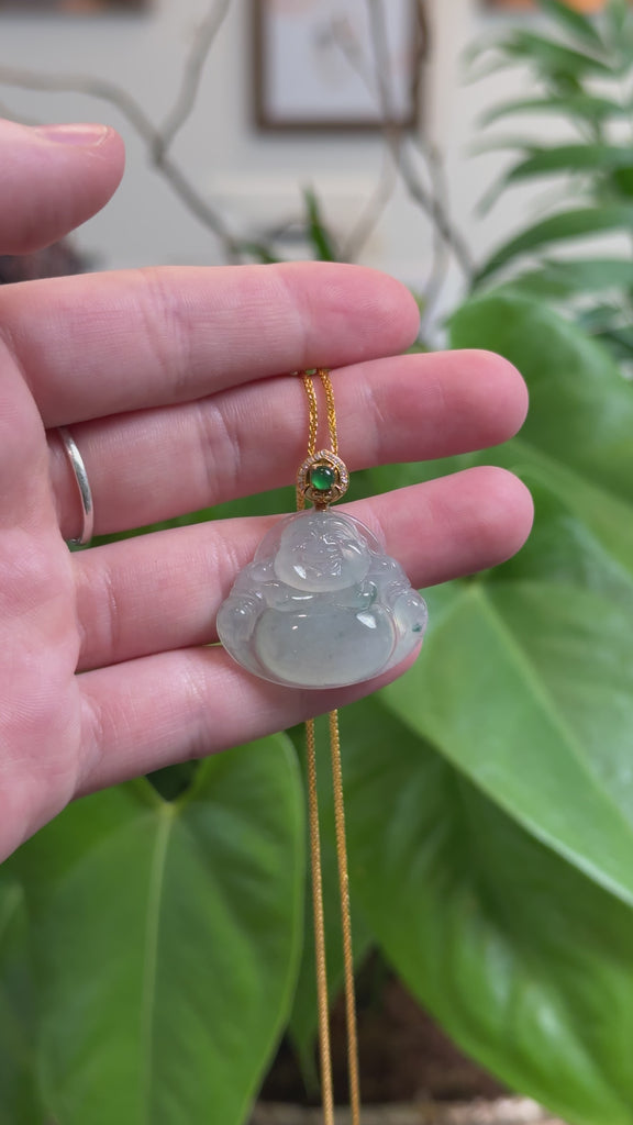 *Design concept--- This beautiful pendant is made from icy jadeite jade and features expert carving. Wearing a Happy Baby Buddha pendant is said to attract positive energy and uplift your surroundings. It symbolizes the release of negativity and encourages resilience. The term "Buddha" means "enlightened one," representing guidance and protection. This pendant embodies prosperity and good fortune, making it a perfect accessory for everyday wear.