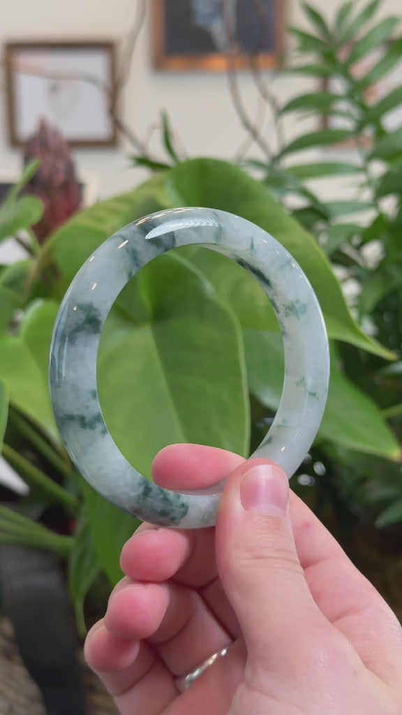 * DETAILS--- Genuine Burmese Ice Blue-green Jadeite Jade Bangle Bracelet. This bangle is made with very high-end genuine Burmese ice green jadeite jade. The jade texture is so transparent with blue-green. The blue-green color and  ice texture, are truly a mesmerizing combination. The Classic half-round style bracelet. it looks very luxurious and  high-end gift for yourself or your love. It's a collectible item.