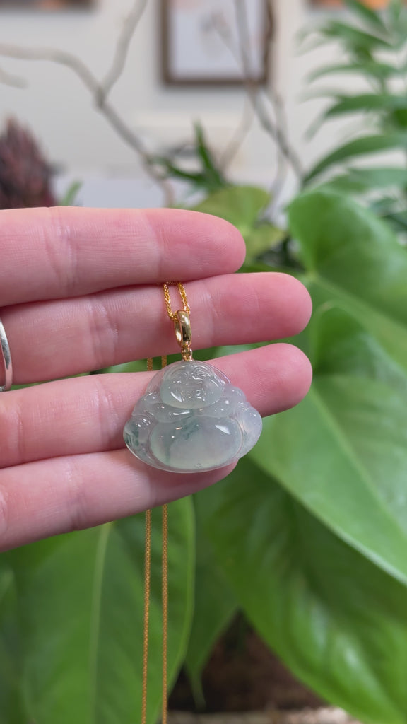 *Design concept--- This lovely pendant is made from icy blue-green jadeite jade with expert carving and an ice-like texture. Wearing a Happy Buddha pendant is believed to bring positive energy and joy. It symbolizes letting go of negativity and staying strong. "Buddha" means "enlightened one," offering guidance and protection. For those who follow Buddhism, this pendant represents good fortune and prosperity, making it a meaningful choice for daily wear.