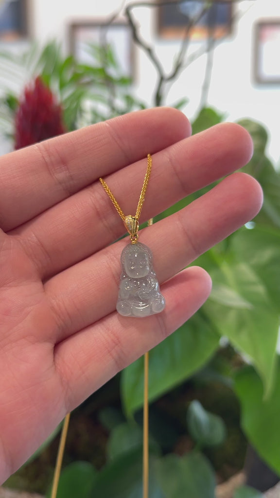 *Design concept--- This beautiful pendant is made from icy jadeite jade and features expert carving. Wearing a Happy Baby Buddha pendant is said to attract positive energy and uplift your surroundings. It symbolizes the release of negativity and encourages resilience. The term "Buddha" means "enlightened one," representing guidance and protection. This pendant embodies prosperity and good fortune, making it a perfect accessory for everyday wear.