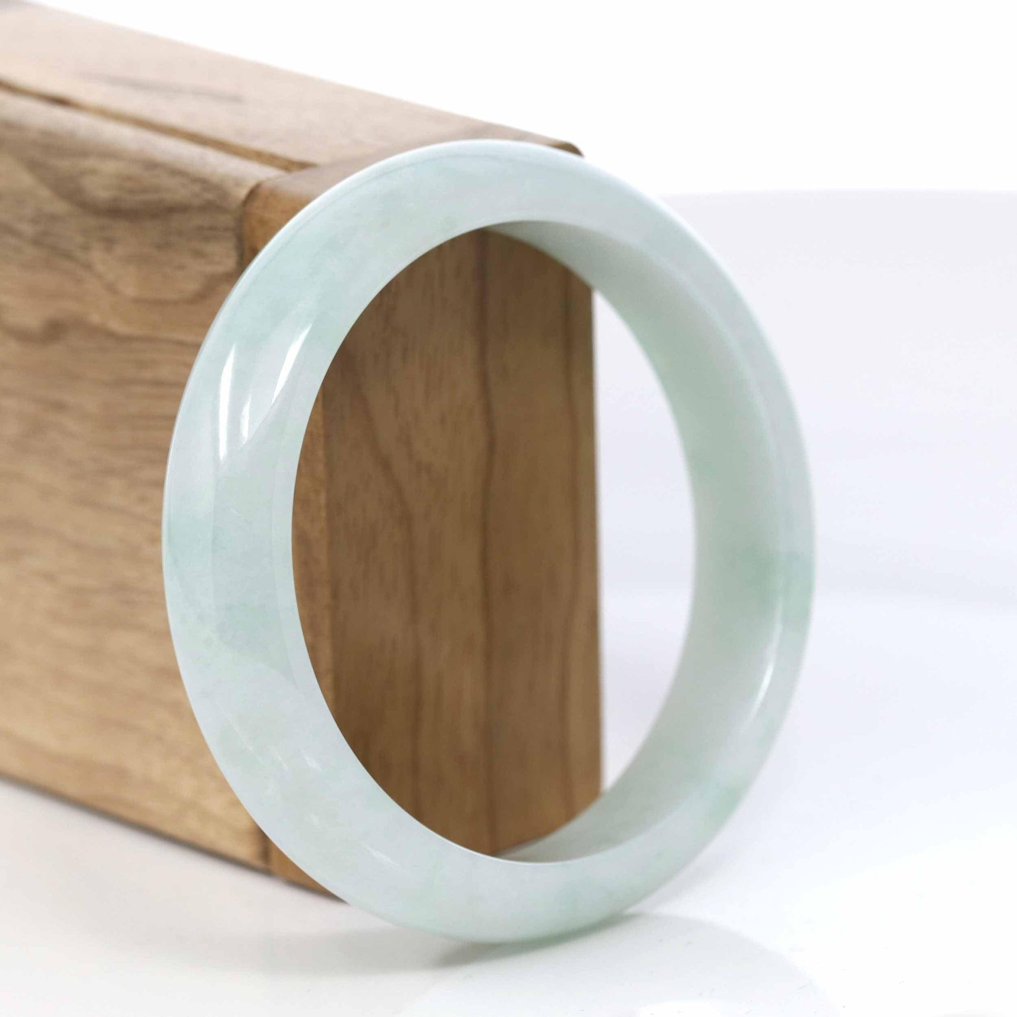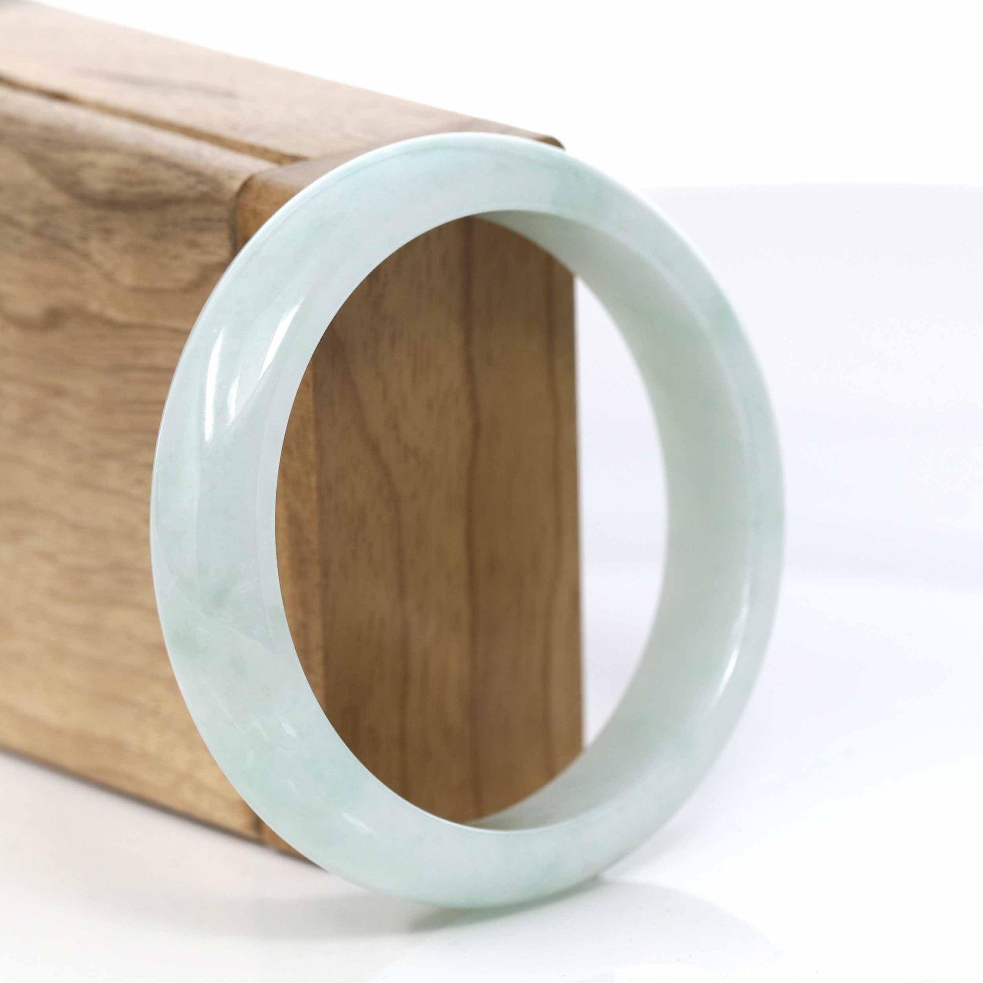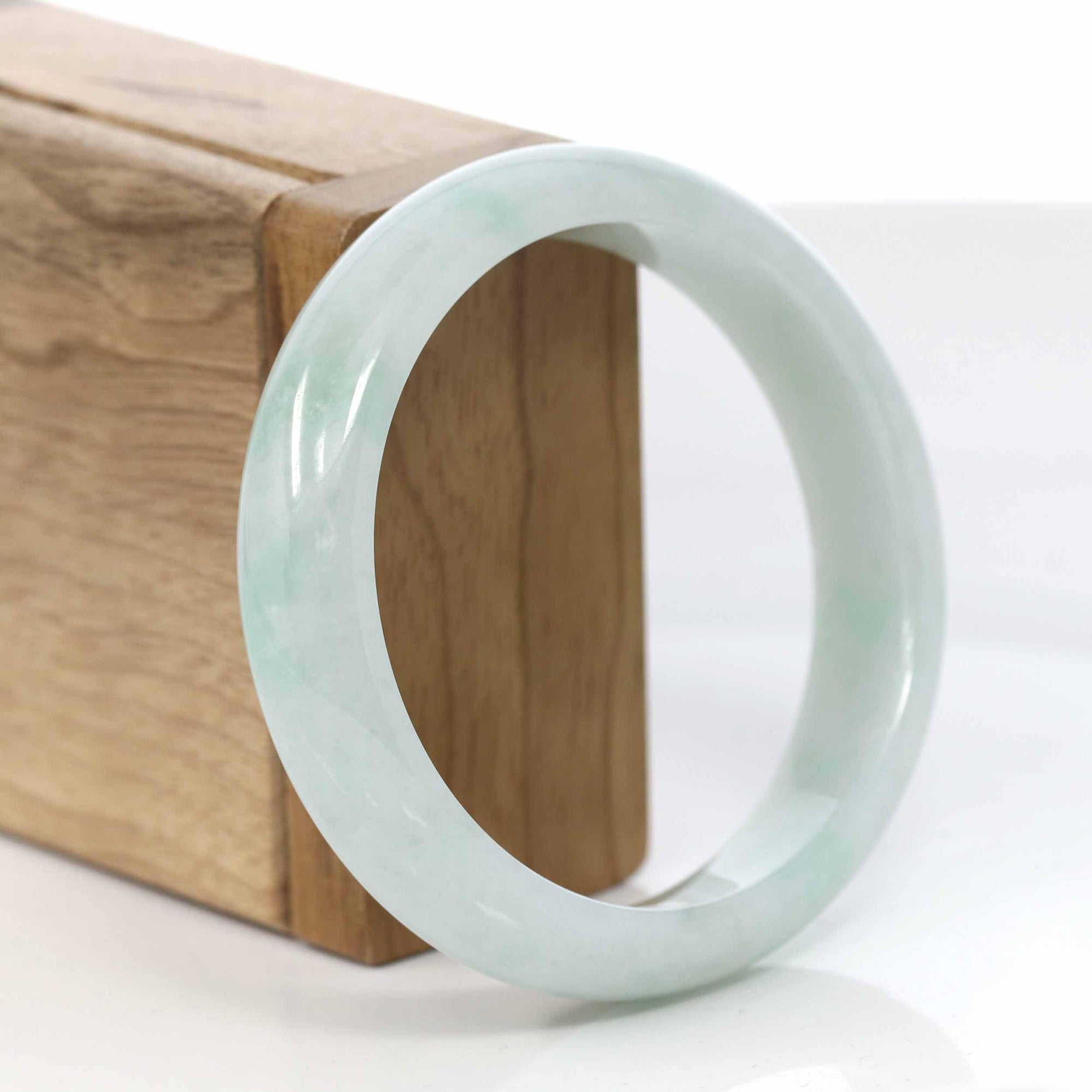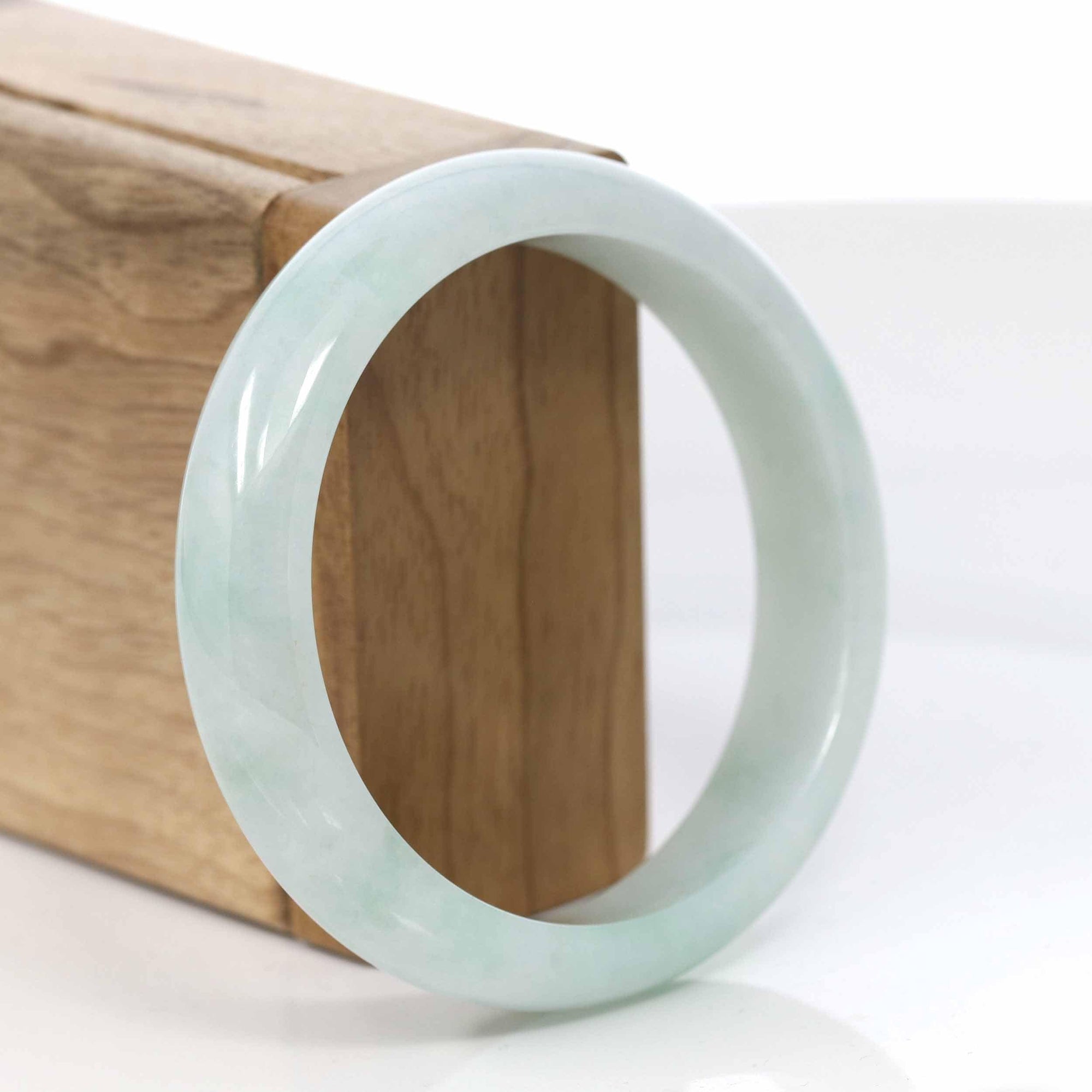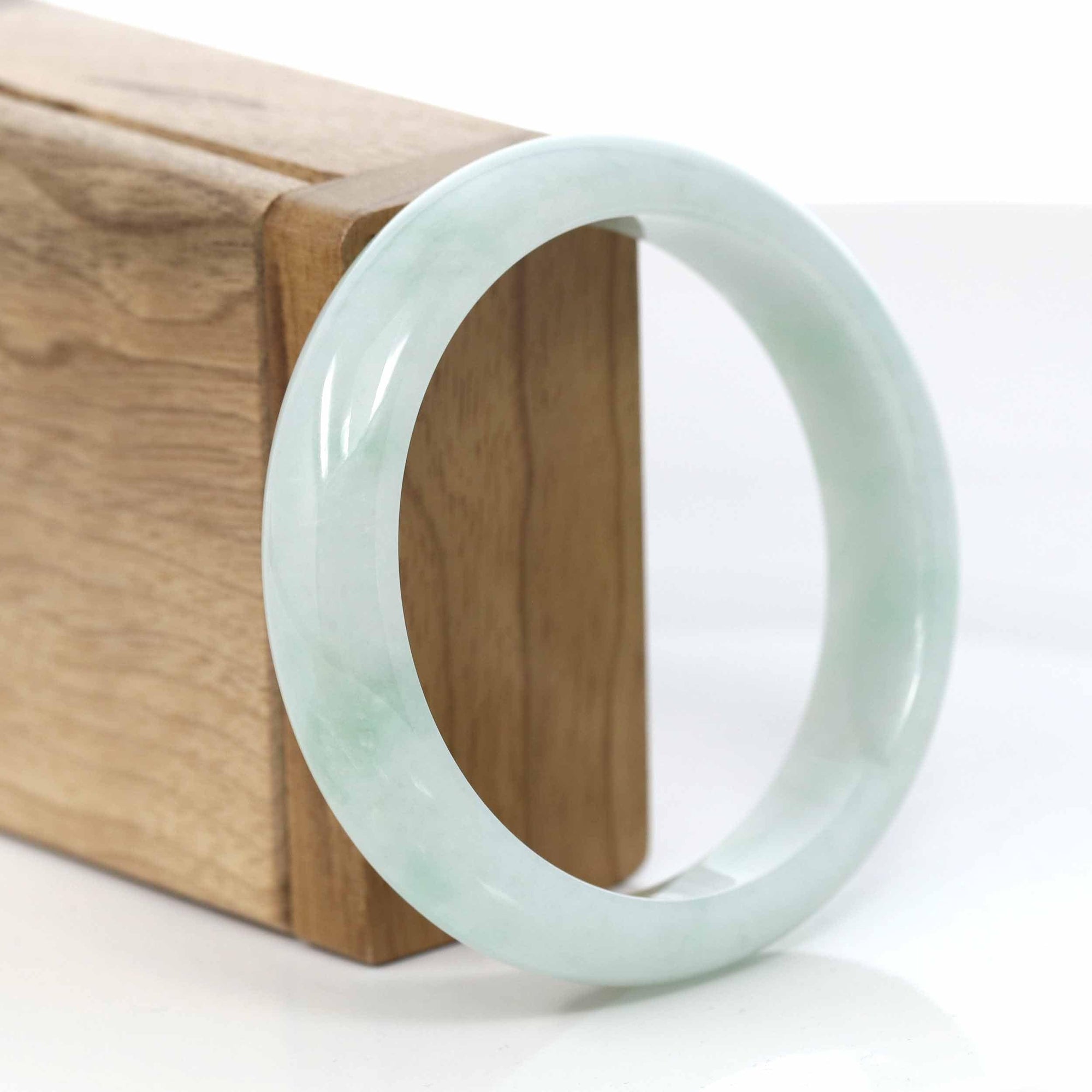 * DETAILS--This bangle is made with Burmese white jadeite jade. The jade texture is very smooth without any flaws. Looks clear with a blue-green color. It's a princess half-round comfit style. You know the genuine jade bangle is always meaningful for someone. It's a very special gift for yourself and your love.