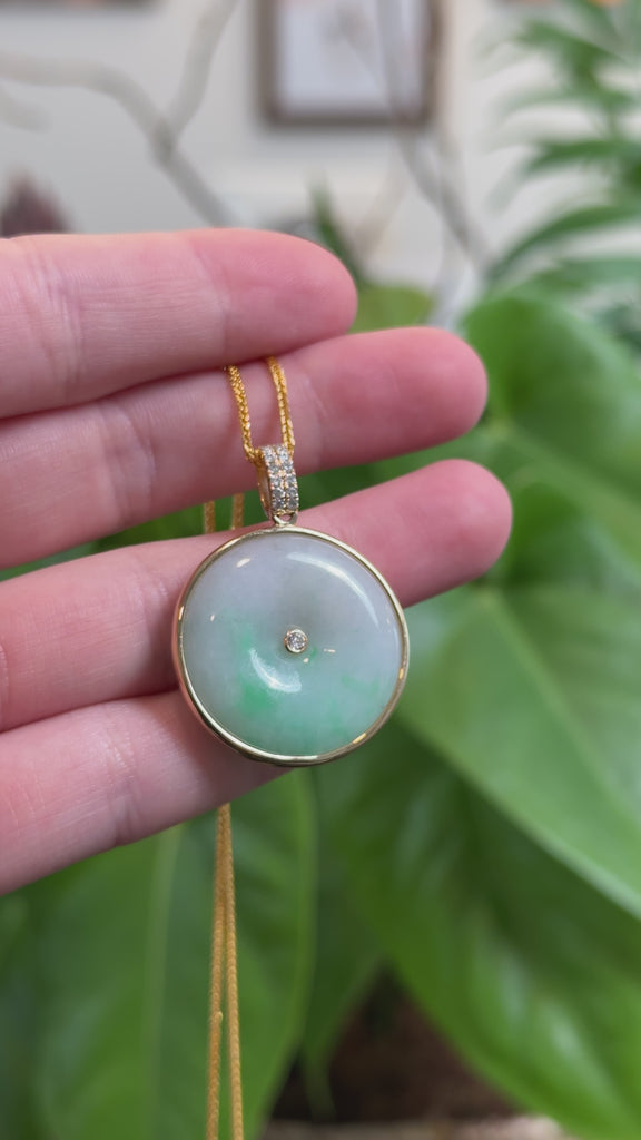 * Design Concept--- The simple shape of a circle represents things such as happiness, wholeness, and prosperity. This necklace is made with very high-quality genuine Burmese green jadeite jade. and made with 14K yellow solid gold with VS1 Diamond. The texture is very translucent from the old mine. The pattern looks like landscaping. Gifting one of these is like wishing the best of luck to your family or loved ones. It's a significant gift.
