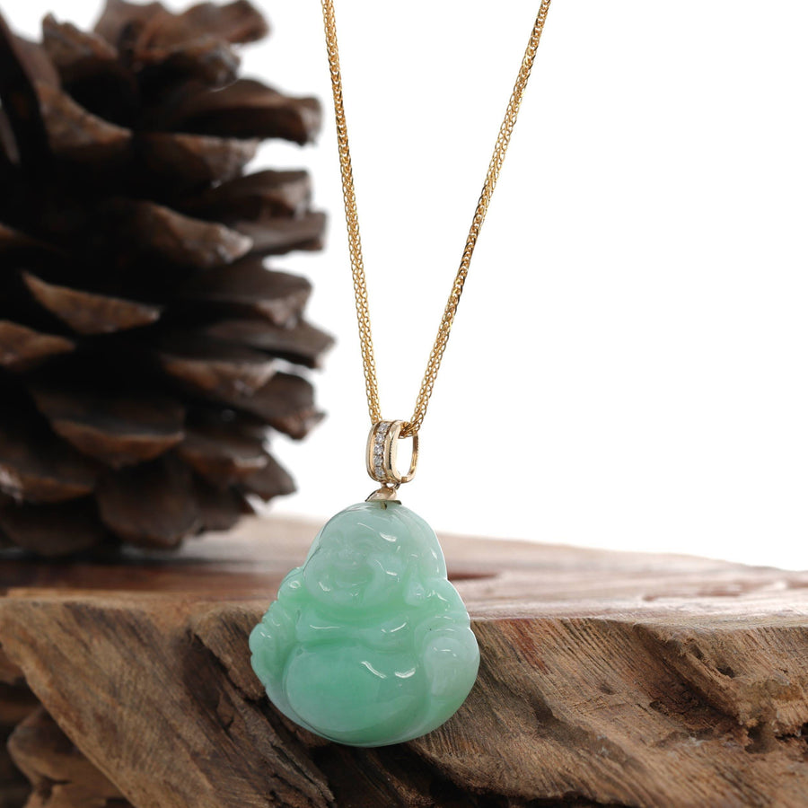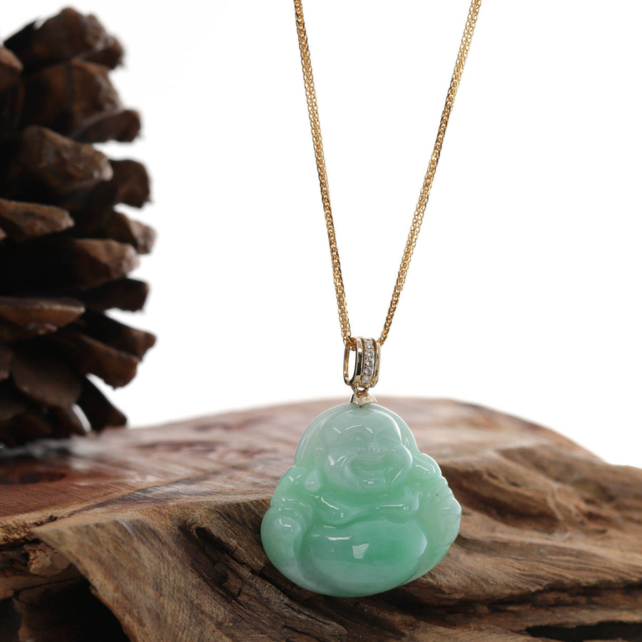 Baikalla Jewelry Jade Pendant Natural Burmese Jadeite Jade "Laughing Buddha" With 14k Yellow VS1 Diamond Bail