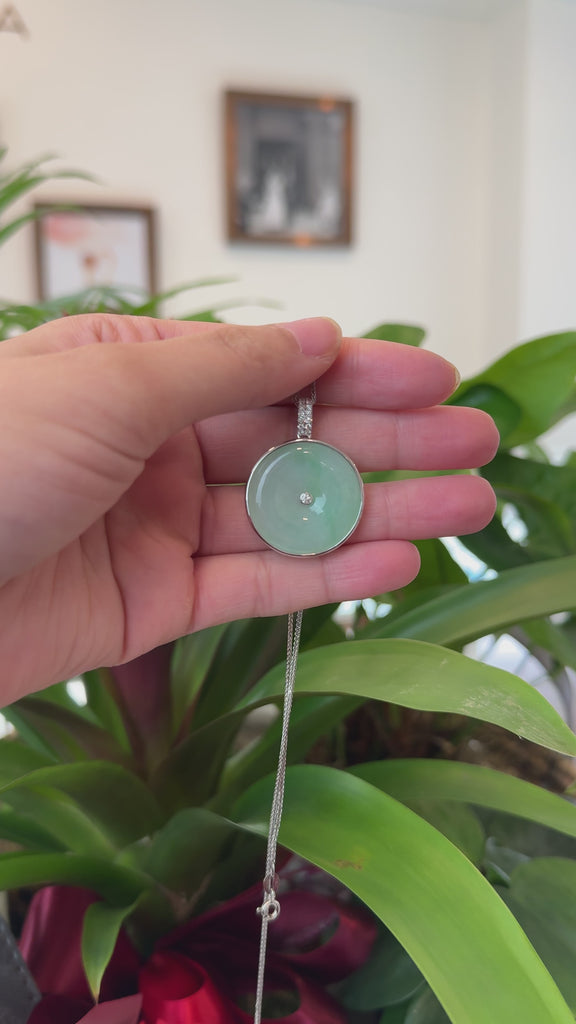 18K White Gold "Good Luck Button" Necklace Icy Green Jadeite Jade Pendant Necklace