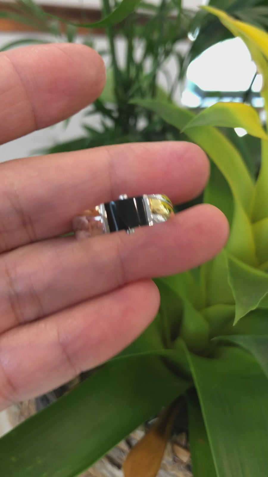 * DESIGN CONCEPT---  This ring is made with high-quality genuine Burmese black jadeite jade. The black jadeite actually shows the emerald green color under the light and very translucent as the picture shows. Bezel set emerald cut stone with unique side stone design with sapphire , with the two-tone color gold, truly a mesmerizing combination. Black jade is relatively a rare stone to be found in rings, but they sure are beautiful. The design was inspired by the simplistic designs of barring for men. Fine polish. Every detail and angle is perfect. It's a very unique nice men's or women's ring.