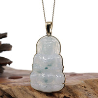 *Design concept--- Made with genuine Burmese ice-blue jadeite jade. The excellent craftsmanship portrays the "goddess of compassion", the Guan Yin. The handcraft is stunning. This particular necklace has amazing translucency, with a very special blue-green color matrix. Great size for both men and women.