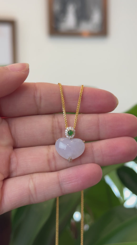 * DESIGN CONCEPT--- Experience the epitome of elegance with the Baikalla 14K White Gold Genuine Burmese Lavender Jadeite Jade Heart Pendant, a true masterpiece in the realm of high jewelry. Made with rare, high-quality genuine lavender Burmese jadeite jade, the design was inspired by the simplistic yet elegant motif of a heart. Symbolizing love, balance, and joyful connections the pendant is accented with diamonds. Celebrate your unique style with this exquisite pendant