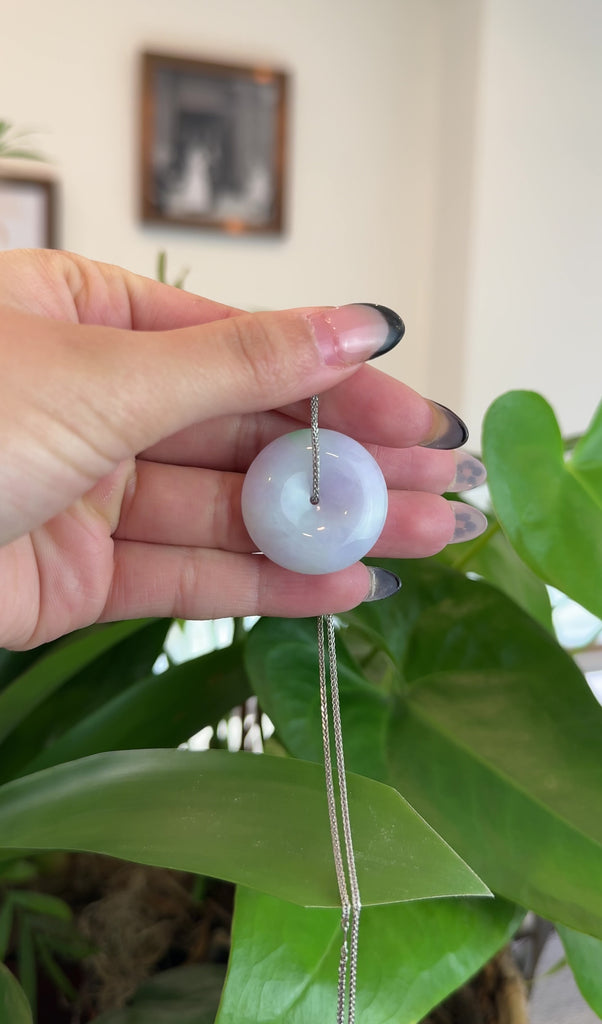 Design Concept--- The simple shape of a circle represents things such as happiness, wholeness, and prosperity. Also known as the "Circle of Heaven". This necklace is made with very high-quality genuine lavender jadeite jade from Burma. Which produces some of the finest in the world. Refined, exquisite. Very very slightly included. Gifting one of these is like wishing the best luck upon your family or loved ones. It's a perfect gift.