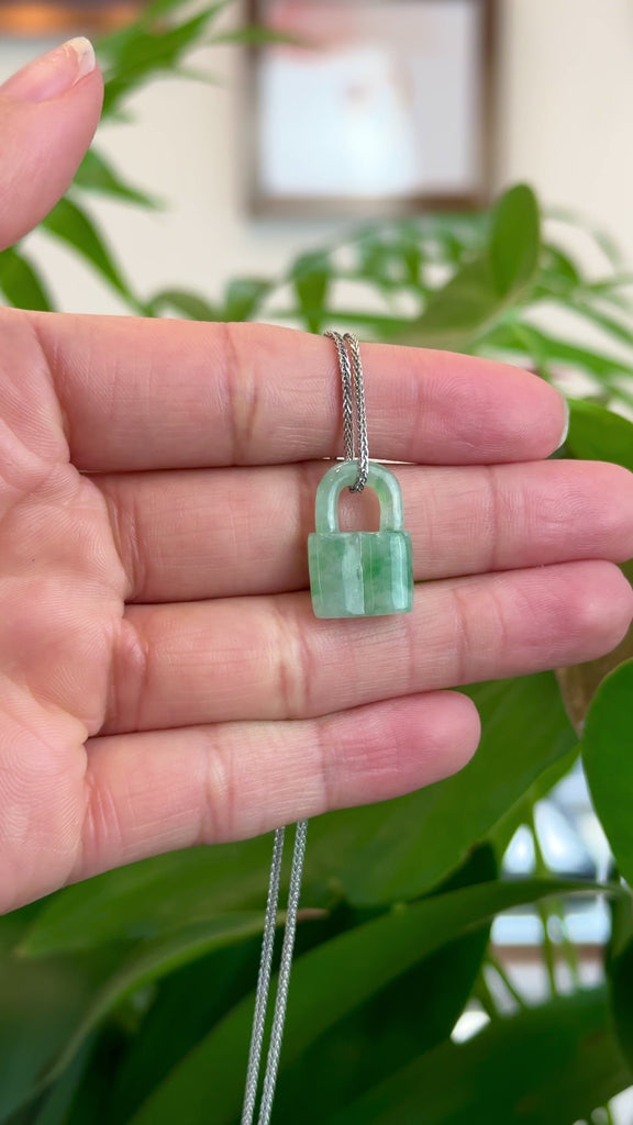 * Design Concept--- Introducing Baikalla's Ice Blue-Green Jadeite Jade Lock Necklace Pendant. This necklace is shaped like a lock symbolizing security and commitment. The texture of jadeite jade is semi smooth with unique yellow and green color. Perfect for you or your loved one.