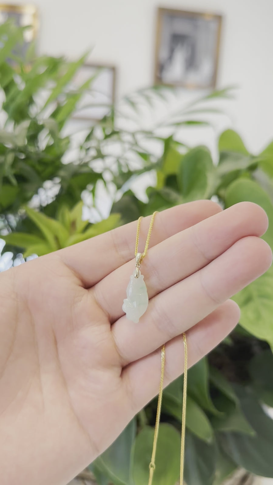 * Design concept--- Genuine Natural Jadeite Jade Fish Pendant Necklace. With a solid 14k yellow gold bail. The meaning of the fish is "More and more every new year". This Chinese proverb is "年年有余" literally meaning "every year, there is more left". In Chinese, the word for "leftover" sounds the same as fish. So it is believed that the barer of a necklace like this. Will attract good fortune, in their career, family lives, and success to come! This necklace makes a great gift for any friends or family.