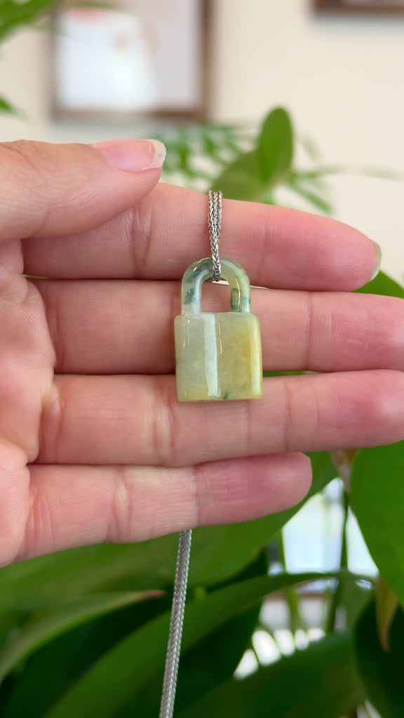 * Design Concept---Natural Yellow Green and Ice Jadeite Jade Lock Necklace Pendant. This necklace is shaped like a lock symbolizing a love that is secure, enduring, and protected. The texture of jadeite jade is semi smooth with unique yellow and green color . Perfect for you or your loved one.