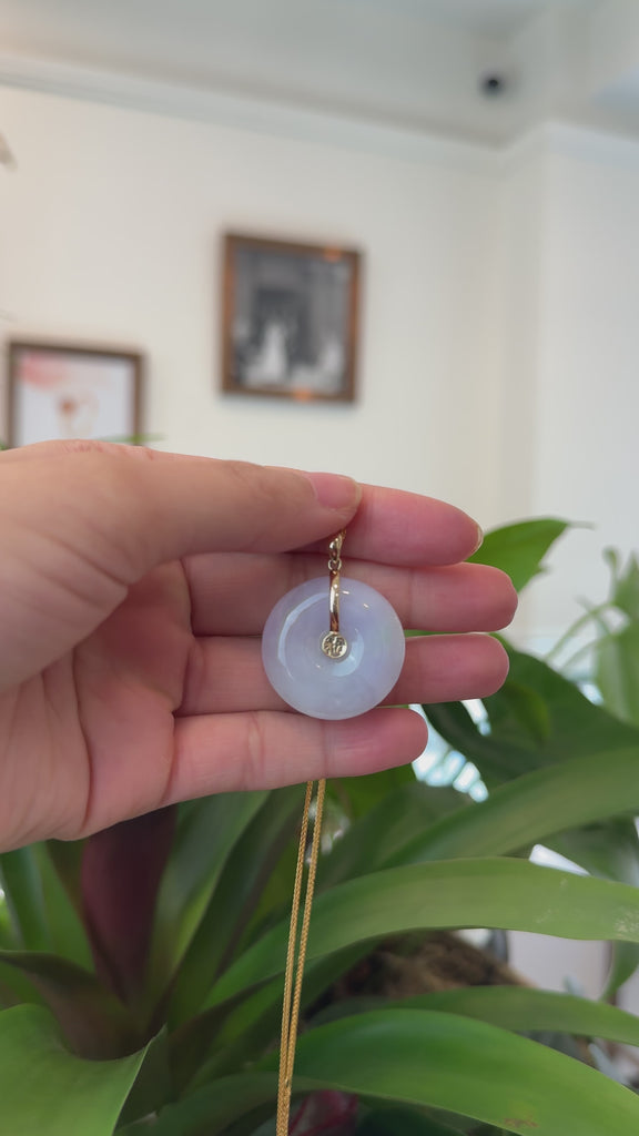 * Design Concept--- The simple shape of a circle represents things such as happiness, wholeness, and prosperity. This necklace is made with very high-quality genuine Burmese green lavender jadeite jade. and made with 14K solid gold. The texture is very translucent. The center pattern is Chinese words Fu ( Happiness ) shape. Gifting one of these is like wishing the best of luck to your family or loved ones. It's a significant gift.