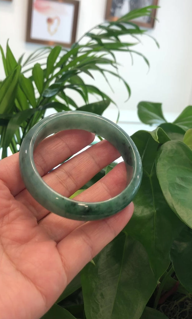 * DETAILS---This bangle is made with genuine Burmese old mine Jadeite jade, The jade texture is very smooth and translucent with forest green color inside. The green color looks very nice with a little dark spot.. It's a very unique color bangle. You know the genuine jade bangle is always meaningful for someone. It's a Classic half round comfort style bracelet. It's a special gift for yourself or your love.