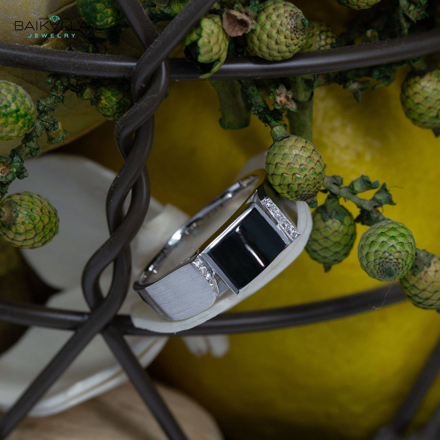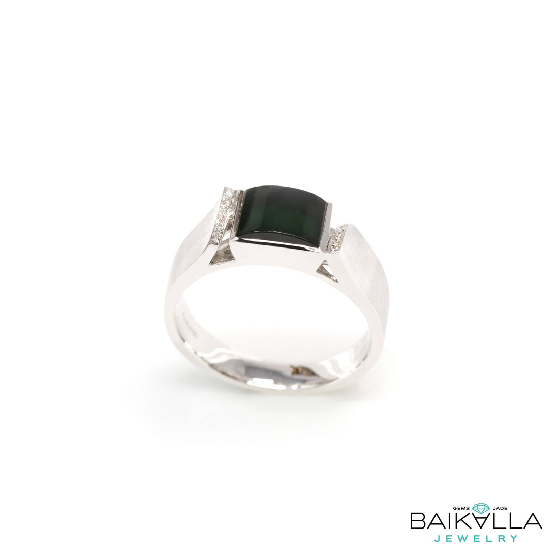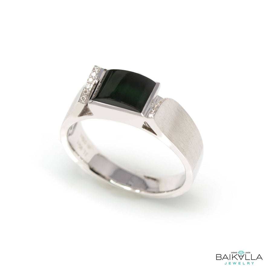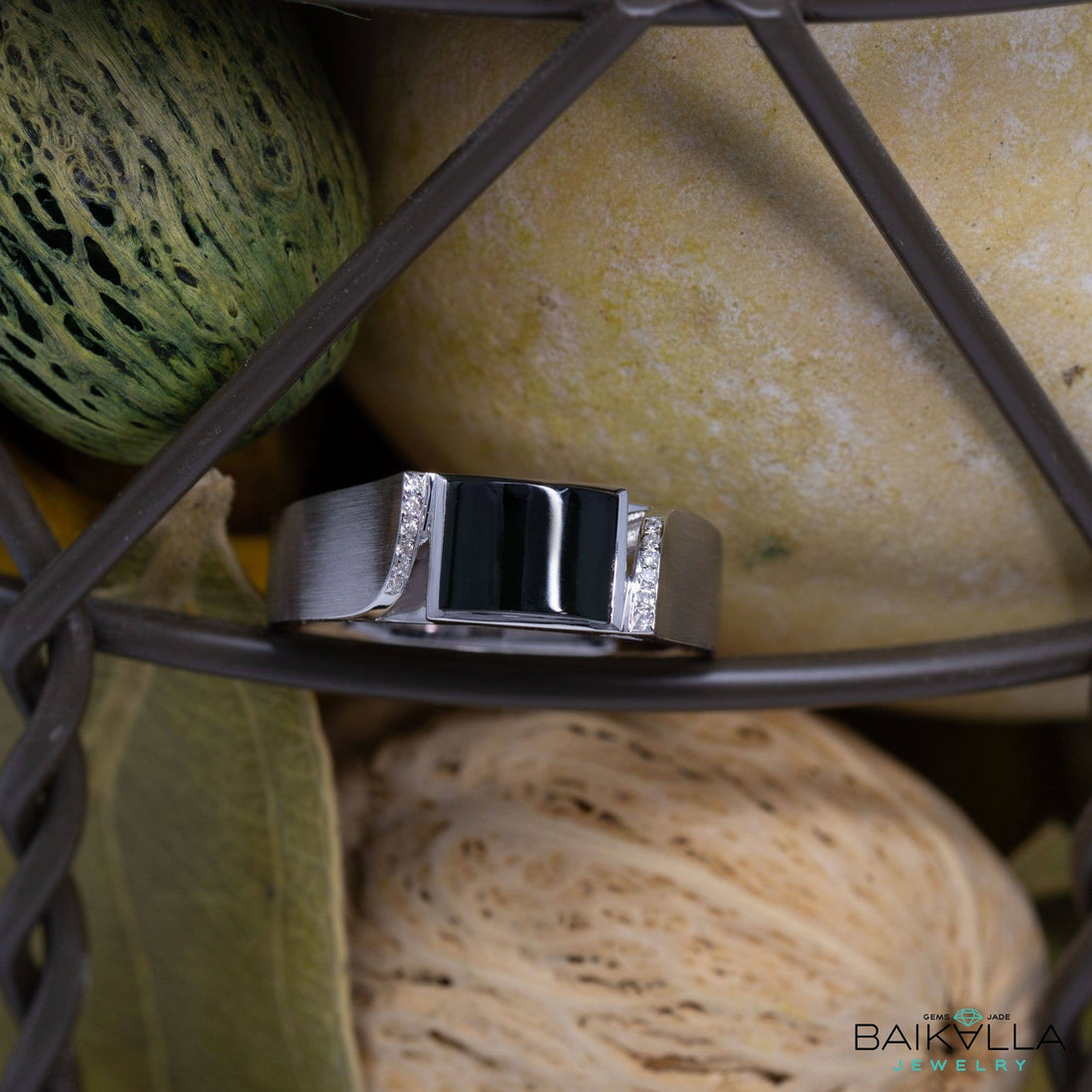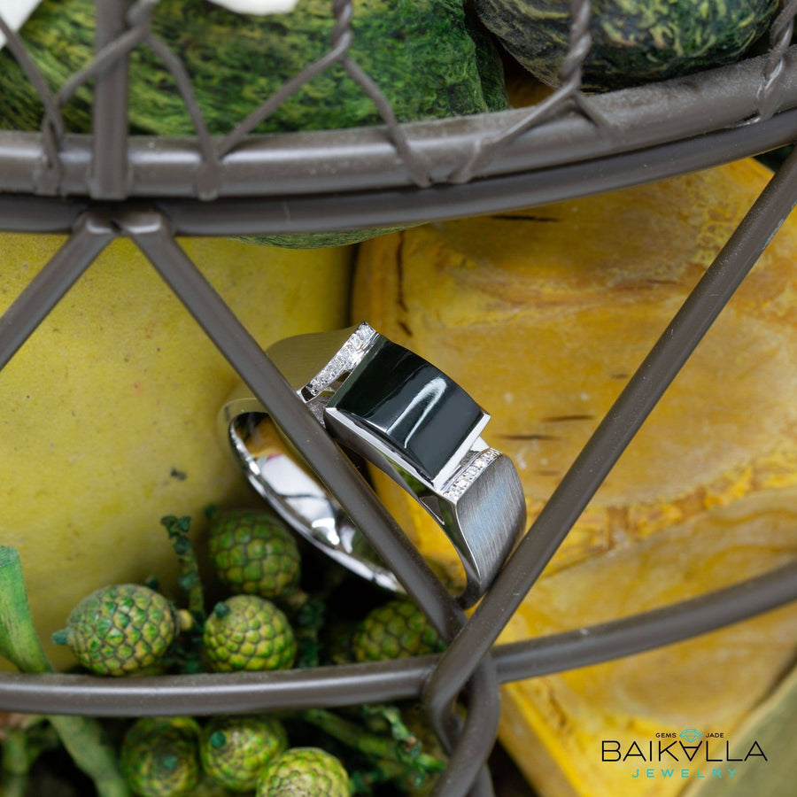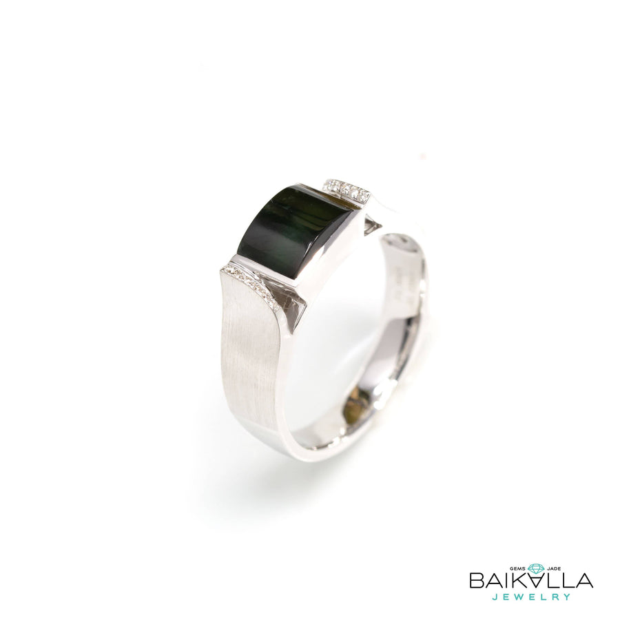 * DESIGN CONCEPT---  This ring is made with high-quality genuine Burmese black jadeite jade. The black jadeite actually shows the emerald green color under the light and very translucent as the picture shows. Bezel set emerald cut stone with unique side stone design, truly a mesmerizing combination. Black jade is relatively a rare stone to be found in rings, but they sure are beautiful.  It also features genuine halo diamonds. The design was inspired by the simplistic designs of a bar ring for men. Fine polish. Every detail and angle is perfect. It's a very unique nice men's ring.