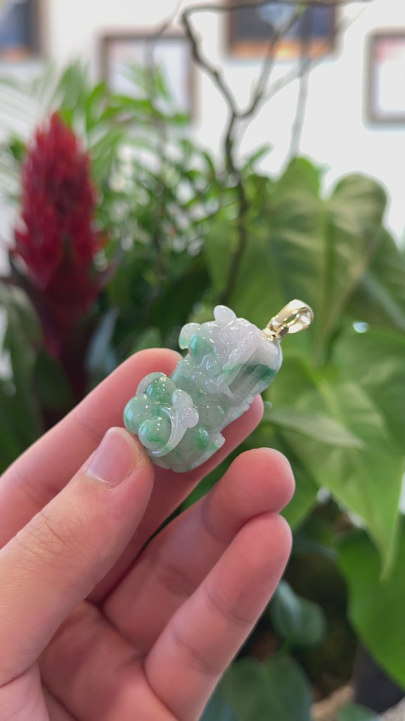 Baikalla Jewelry genuine jadeite carving Genuine Burmese Lavender-Green Jadeite Jade PiXiu Pendant Necklace With 18K Gold Bail