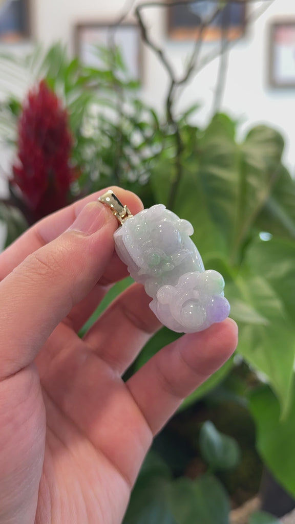 Genuine Burmese Lavender-Green Jadeite Jade PiXiu Pendant Necklace With 14K Gold Bail