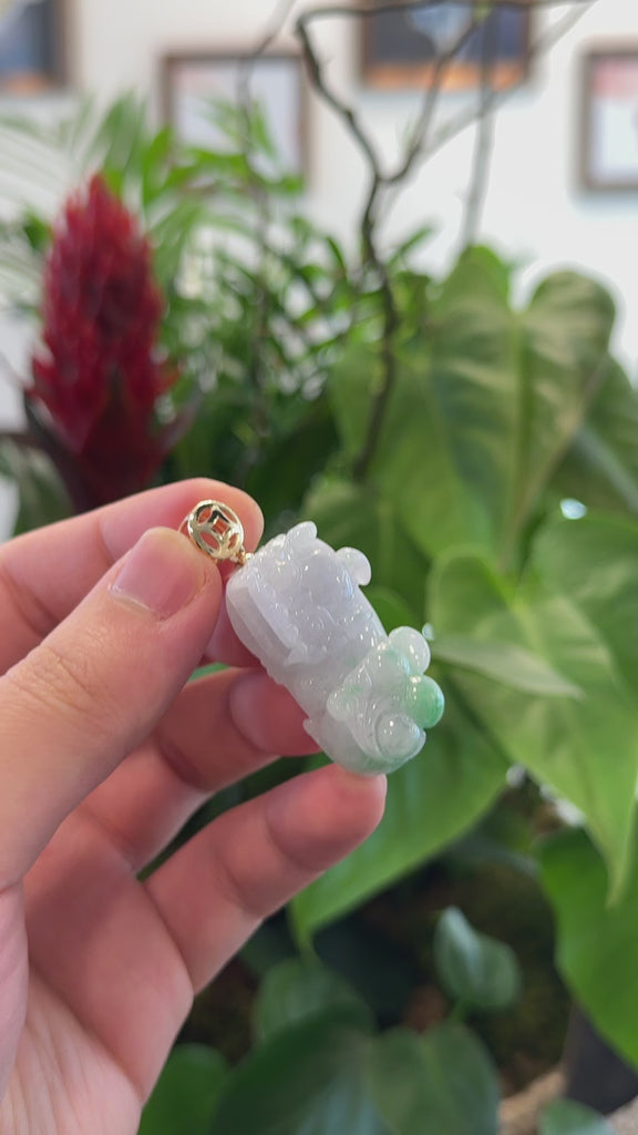 Genuine Burmese Lavender-Green Jadeite Jade PiXiu Pendant Necklace With 18K Gold Bail