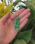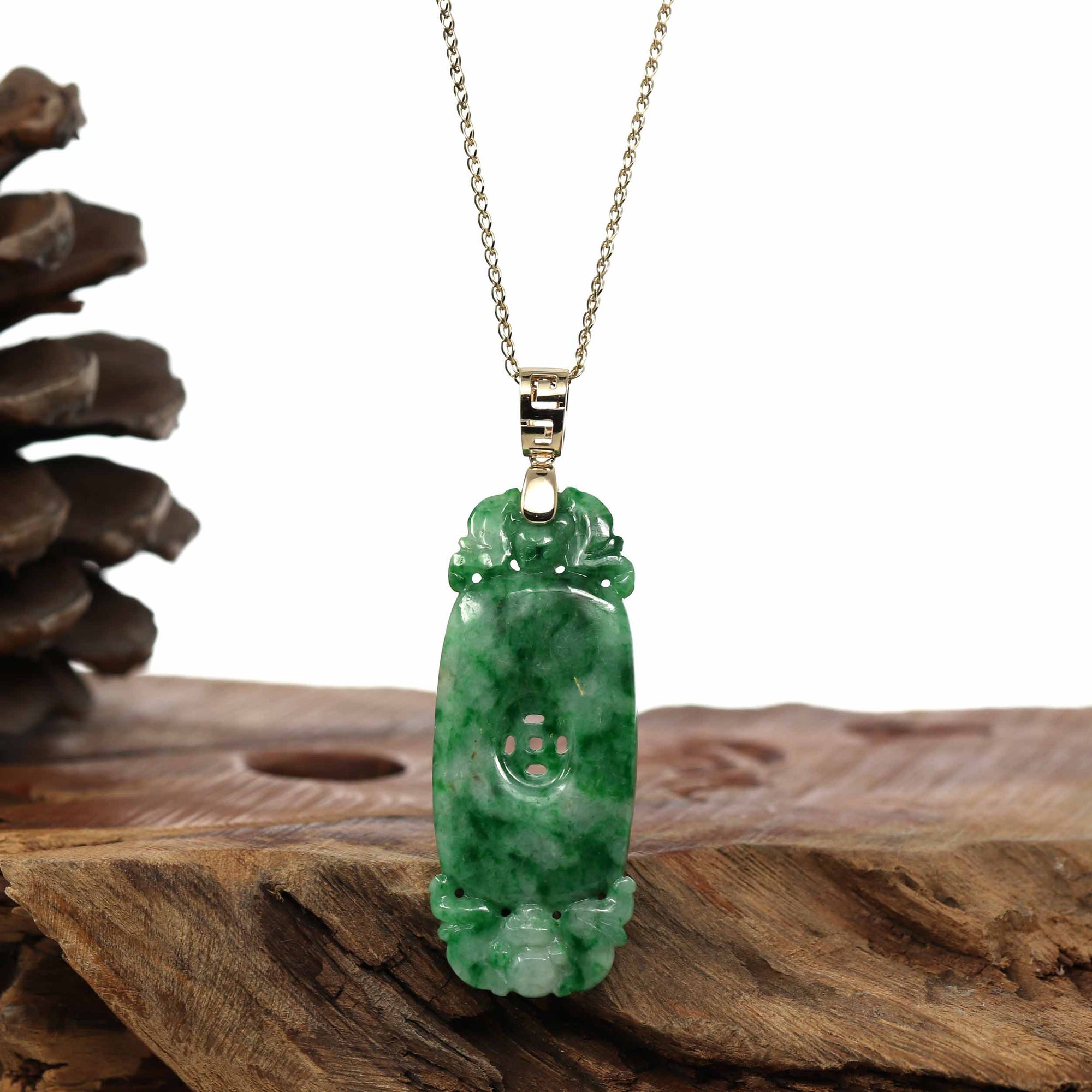 Genuine Apple Green- White Jadeite Jade Fu Zai Yan Qian Pendant Necklace With 14K Yellow Gold Bail
