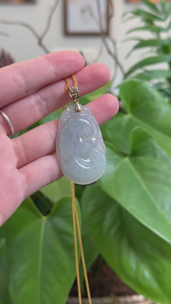 *Design concept-- "Ruyi" in Chinese literally means, "as you wish." This necklace portrays the timeless, good luck symbol in natural ice jadeite jade with blue colors, Perfect for a gift for a friend who is venturing into a new chapter of life or a someone who is venturing into a new business.