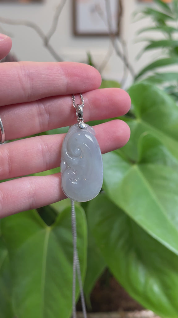 *Design concept-- "Ruyi" in Chinese literally means, "as you wish." This necklace portrays the timeless, good luck symbol in natural ice jadeite jade with light blue colors, Perfect for a gift for a friend who is venturing into a new chapter of life or a someone who is venturing into a new business.