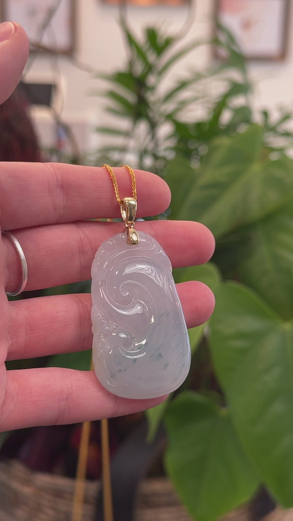 *Design concept-- "Ruyi" in Chinese literally means, "as you wish." This necklace portrays the timeless, good luck symbol in natural ice jadeite jade with light blue colors, Perfect for a gift for a friend who is venturing into a new chapter of life or a someone who is venturing into a new business.