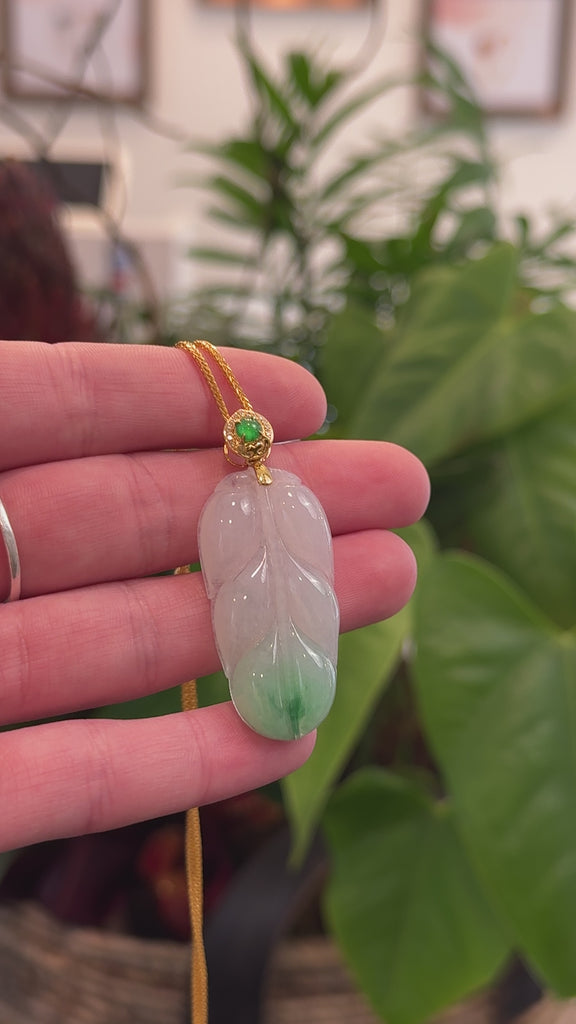 *Design concept--- " Jin Zhi Yu Ye " Golden Branches & Jade Leaves", It's meaning someone is very precious as a princess. Made with genuine Burmese green jadeite jade with 18k gold bail, This pendant looks very nice with ice green jade. It's a very special gift for you and your loved ones.