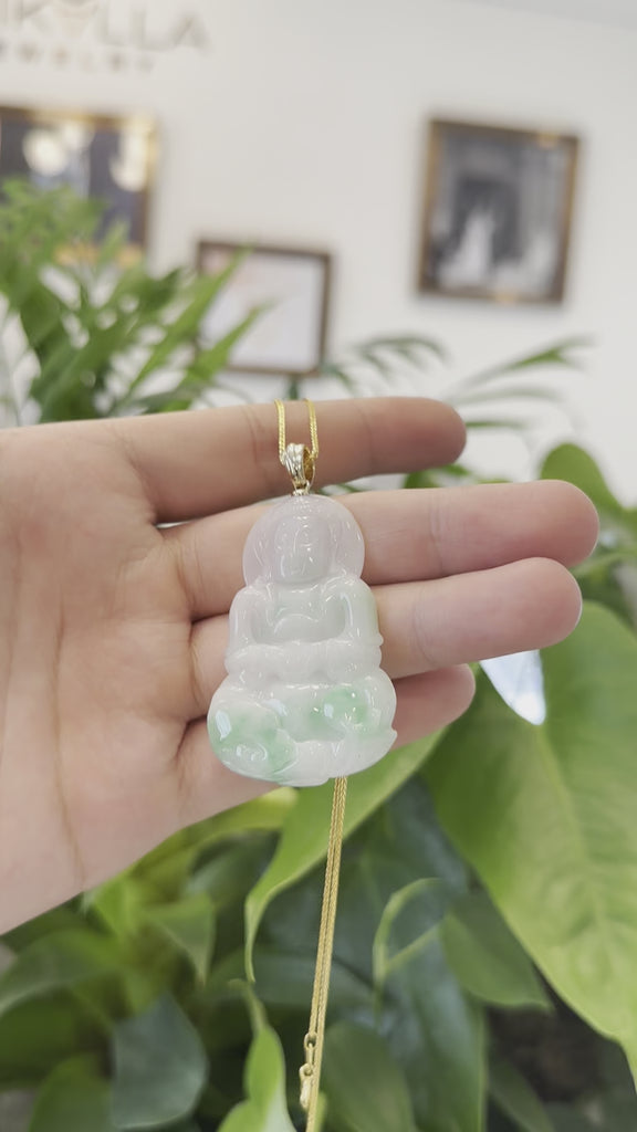 *Design concept--- Made with genuine Burmese jadeite jade. With the goddess sitting on a lotus. The lotus symbolize the one who overcame the pain that prevails in the material world and became enlightened, just like the Lotus flower which starts to grow in the dirty and muddy water but manages to surpass the water and produce a perfect flower. The excellent craftsmanship portrays the "goddess of compassion", the Guan Yin. The handcraft is stunning. Great size for both men and women. Comes with Nylon String Necklace Or Gold Plated Silver Chain. Available with optional gold chain.
