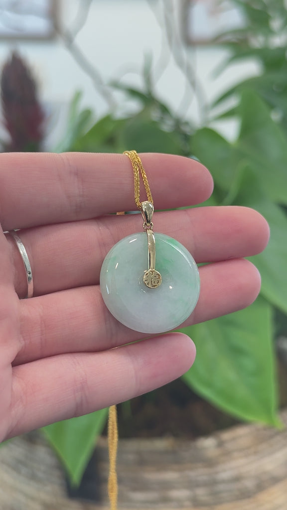 * Design Concept--- The simple shape of a circle represents things such as happiness, wholeness, and prosperity. This necklace is made with very high-quality genuine Burmese green jadeite jade. and made with 14K yellow solid gold simple bail. The texture is very translucent. The center pattern is Fu shape. Gifting one of these is like wishing the best of luck to your family or loved ones. It's a significant gift.