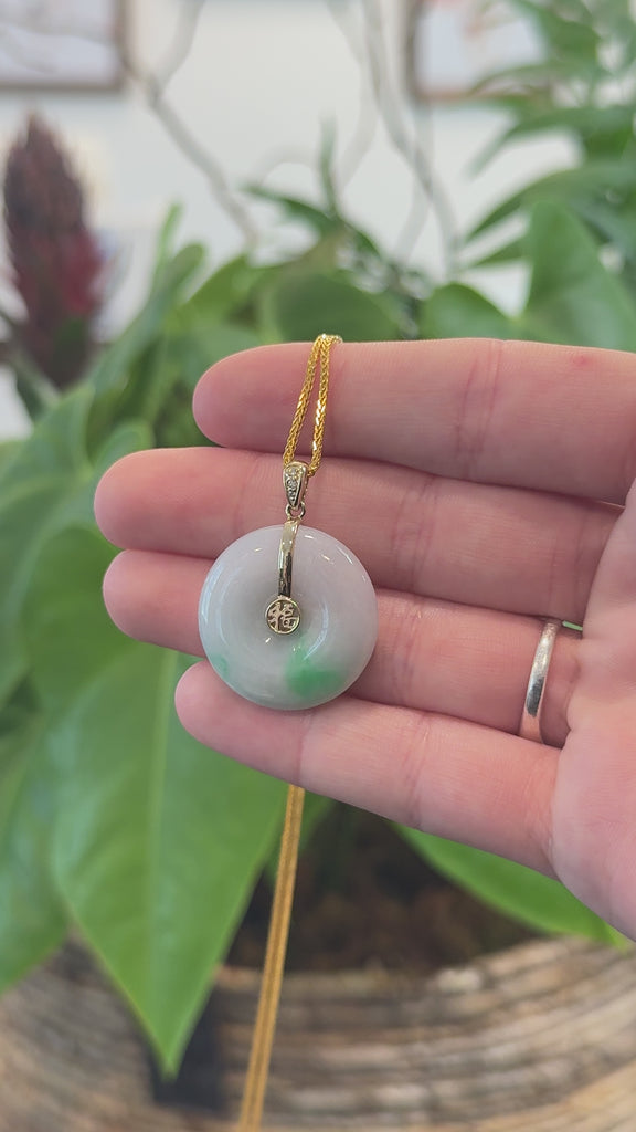 * Design Concept--- The simple shape of a circle represents things such as happiness, wholeness, and prosperity. This necklace is made with very high-quality genuine Burmese green jadeite jade. and made with 14K yellow solid gold simple diamond bail. The texture is very translucent. The center pattern is Fu shape. Gifting one of these is like wishing the best of luck to your family or loved ones. It's a significant gift.