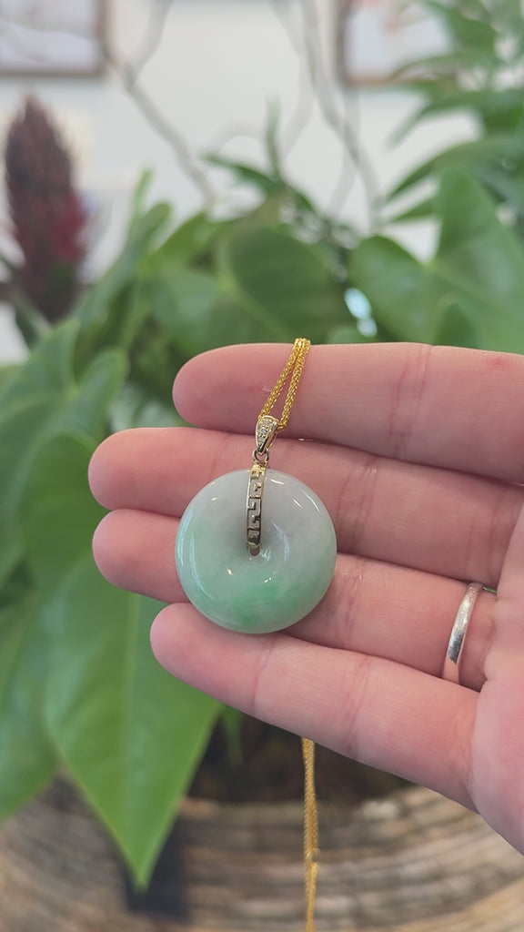* Design Concept--- The simple shape of a circle represents things such as happiness, wholeness, and prosperity. This necklace is made with very high-quality genuine Burmese green jadeite jade. and made with 14K yellow solid gold simple bail. The texture is very translucent. The center pattern is Fu shape. Gifting one of these is like wishing the best of luck to your family or loved ones. It's a significant gift.