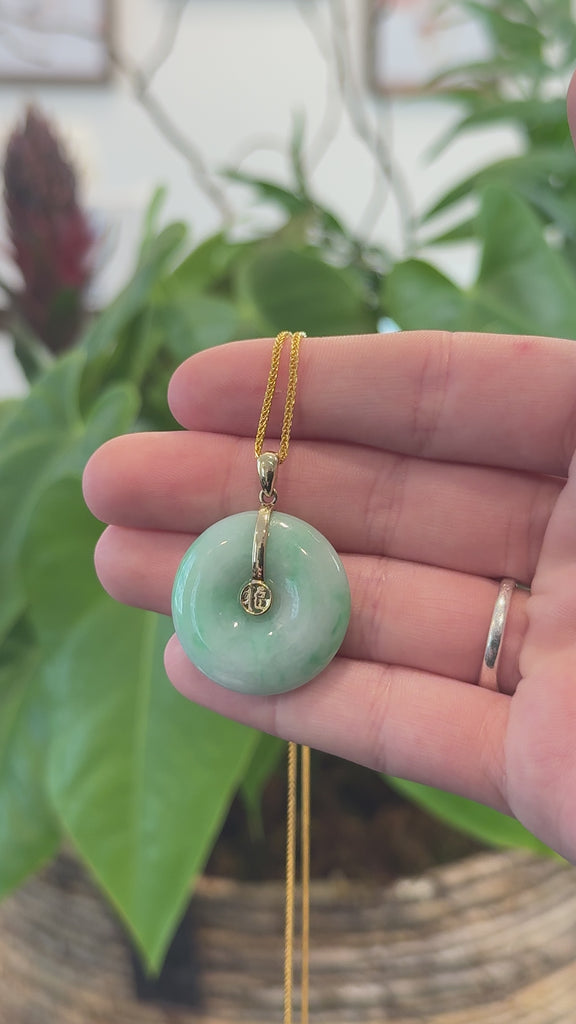 * Design Concept--- The simple shape of a circle represents things such as happiness, wholeness, and prosperity. This necklace is made with very high-quality genuine Burmese green jadeite jade. and made with 14K yellow solid gold simple bail. The texture is very translucent. The center pattern is Fu shape.  Gifting one of these is like wishing the best of luck to your family or loved ones. It's a significant gift.