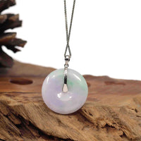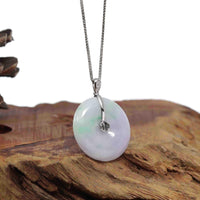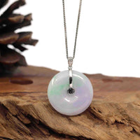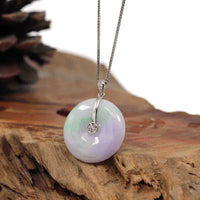 * Design Concept--- The simple shape of a circle represents things such as happiness, wholeness, and prosperity. This necklace is made with very high-quality genuine Burmese green lavender jadeite jade. and made with 14K white solid gold with VS1 Diamond bail. The texture is very translucent. The center pattern is Chinese words Fu (Happiness) shape. Gifting one of these is like wishing the best of luck to your family or loved ones. It's a significant gift.