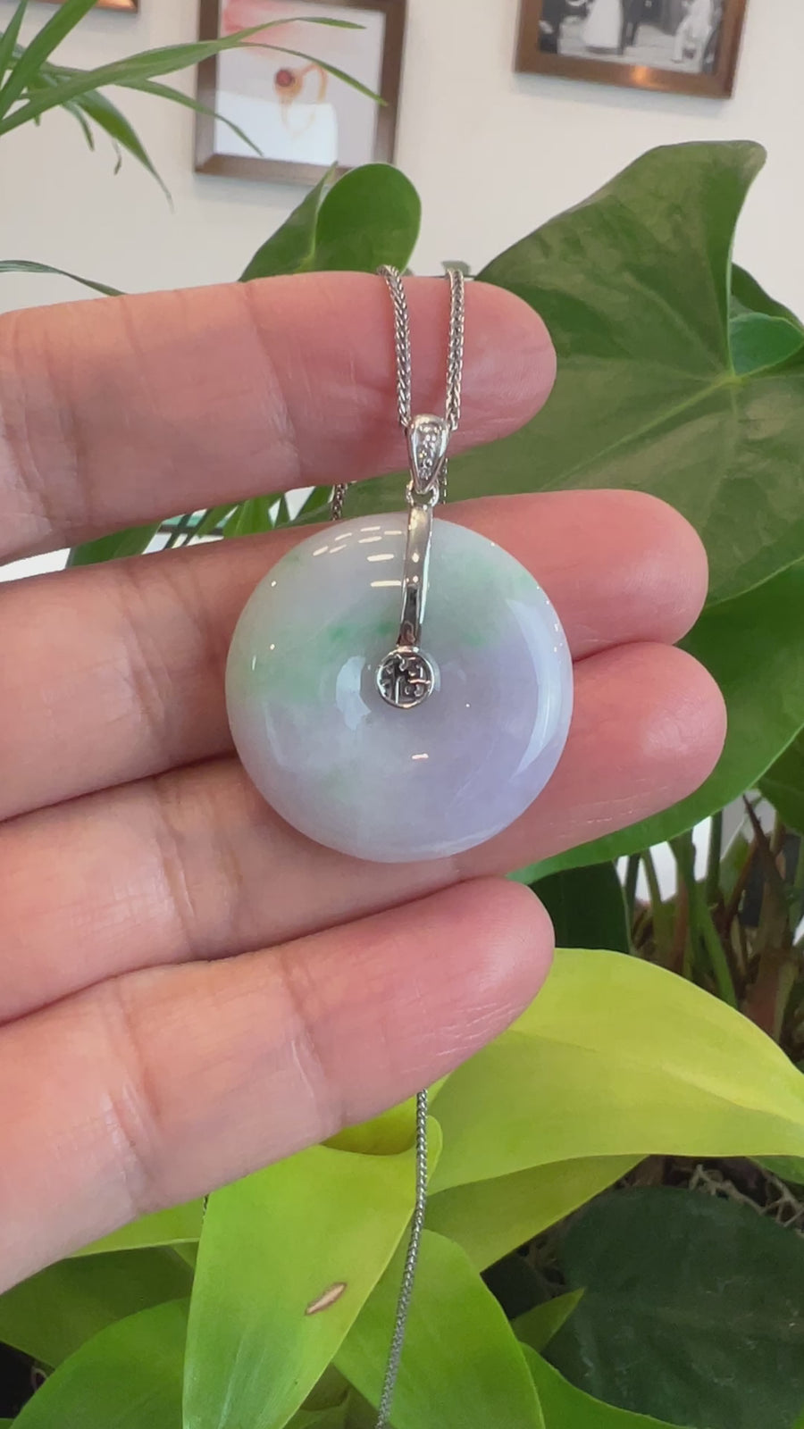 * Design Concept--- The simple shape of a circle represents things such as happiness, wholeness, and prosperity. This necklace is made with very high-quality genuine Burmese green lavender jadeite jade. and made with 14K white solid gold with VS1 Diamond bail. The texture is very translucent. The center pattern is Chinese words Fu (Happiness) shape. Gifting one of these is like wishing the best of luck to your family or loved ones. It's a significant gift.