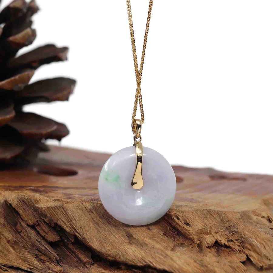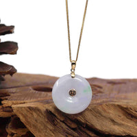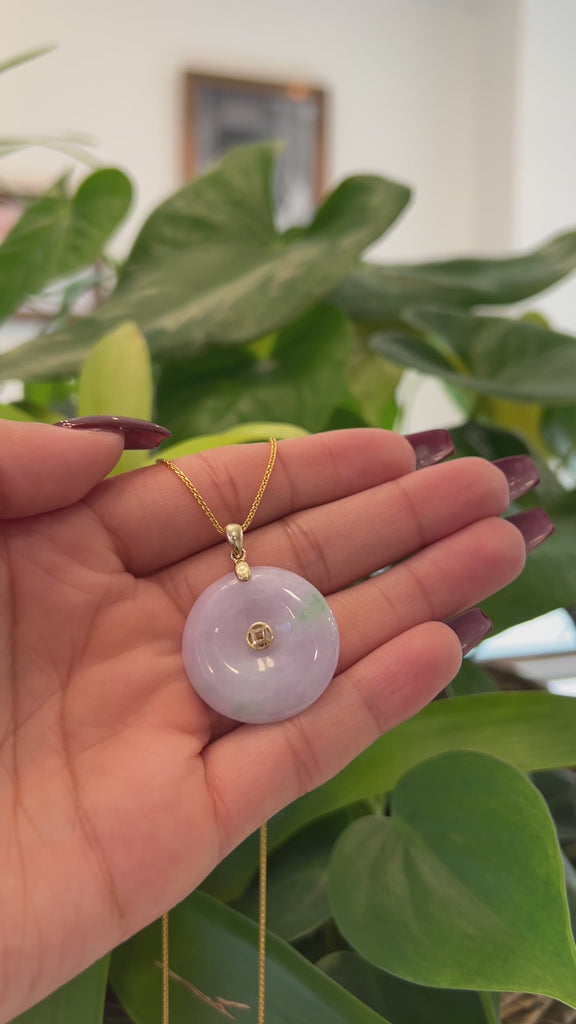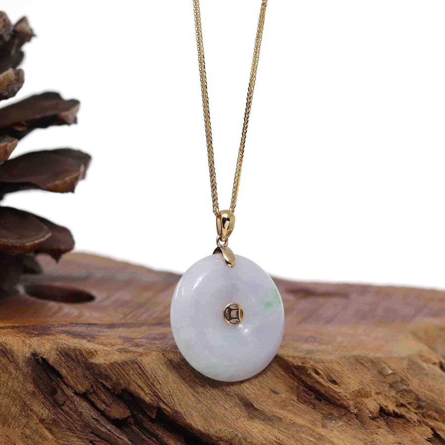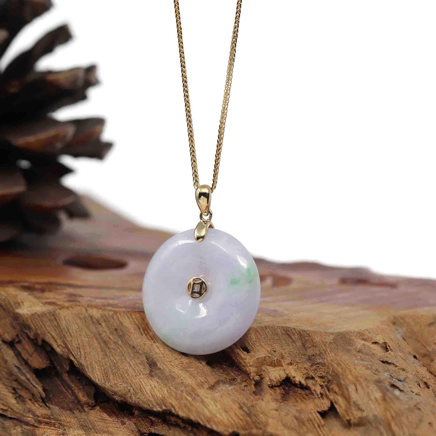 * Design Concept--- The simple shape of a circle represents things such as happiness, wholeness, and prosperity. This necklace is made with very high-quality genuine Burmese green lavender jadeite jade. and made with 14K white solid gold bail. The texture is very translucent. The center pattern is the money coin shape. Gifting one of these is like wishing the best of luck to your family or loved ones. It's a significant gift.