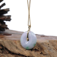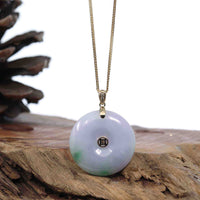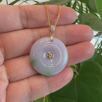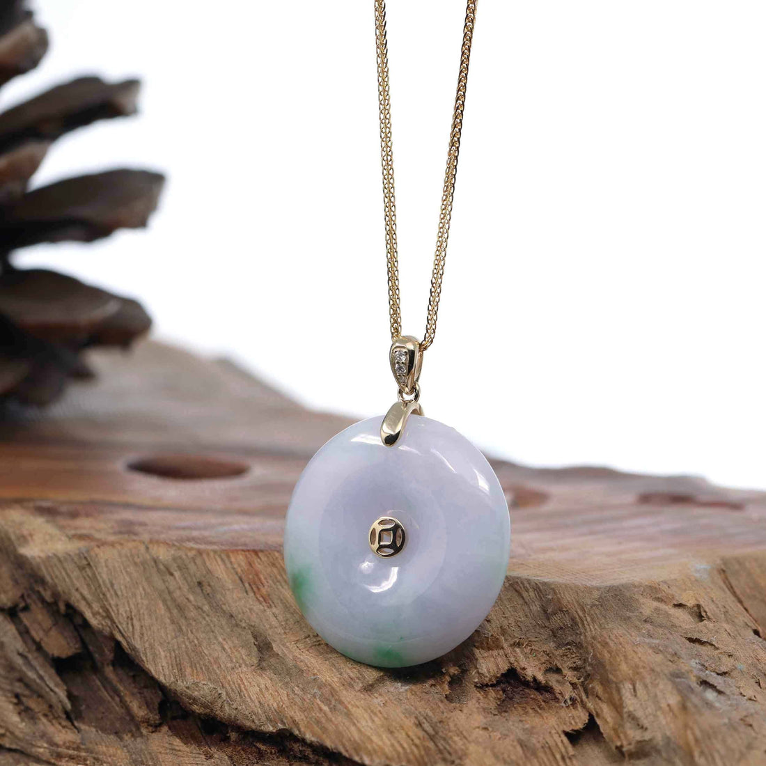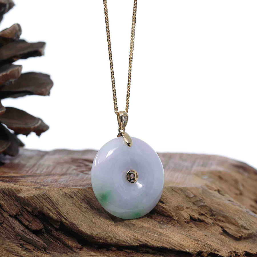 * Design Concept--- The simple shape of a circle represents things such as happiness, wholeness, and prosperity. This necklace is made with very high-quality genuine Burmese green lavender jadeite jade. and made with 14K white solid gold with VS1 Diamond bail. The texture is very translucent. The center pattern is the money coin shape. Gifting one of these is like wishing the best of luck to your family or loved ones. It's a significant gift.
