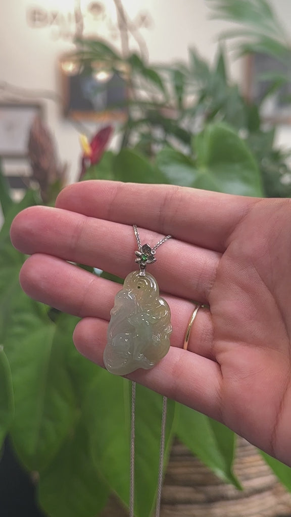 *Design concept--- Genuine Burmese Green Jadeite Jade Nine-Tailed Fox Pendant. This pendant features icy greenish yellow jadeite jade carved intricately, with a smooth texture and translucent texture. The bail is crafted in 18k white gold in a flower design, centered with an imperial jade. The person who wears a Nine-tailed Fox pendant around the neck attracts positive energy. They emit positive waves into the environment around them. The belief is all of the entire negativity is destroyed and a fighting spirit is generated within the person. The term Nine-tailed fox literally means to save and protect you. Representing prosperity, good luck, and wealth. Perfect everyday style, making it not only cute but also uniquely charming.
