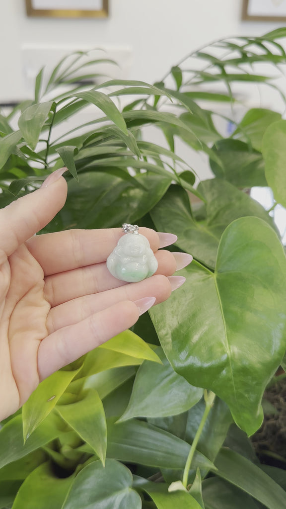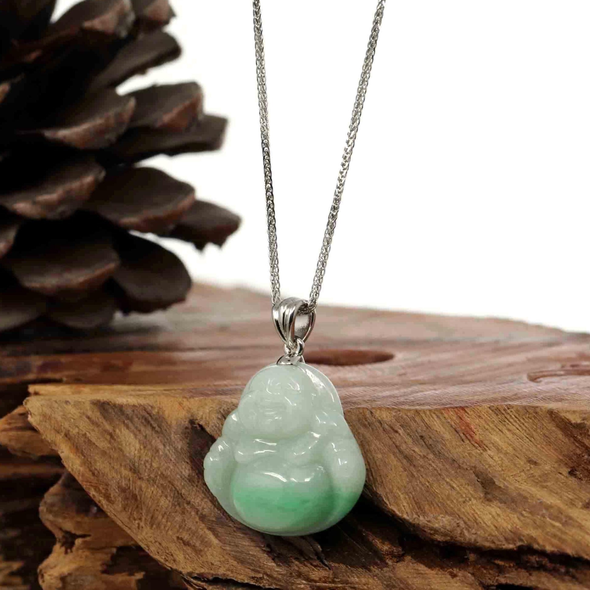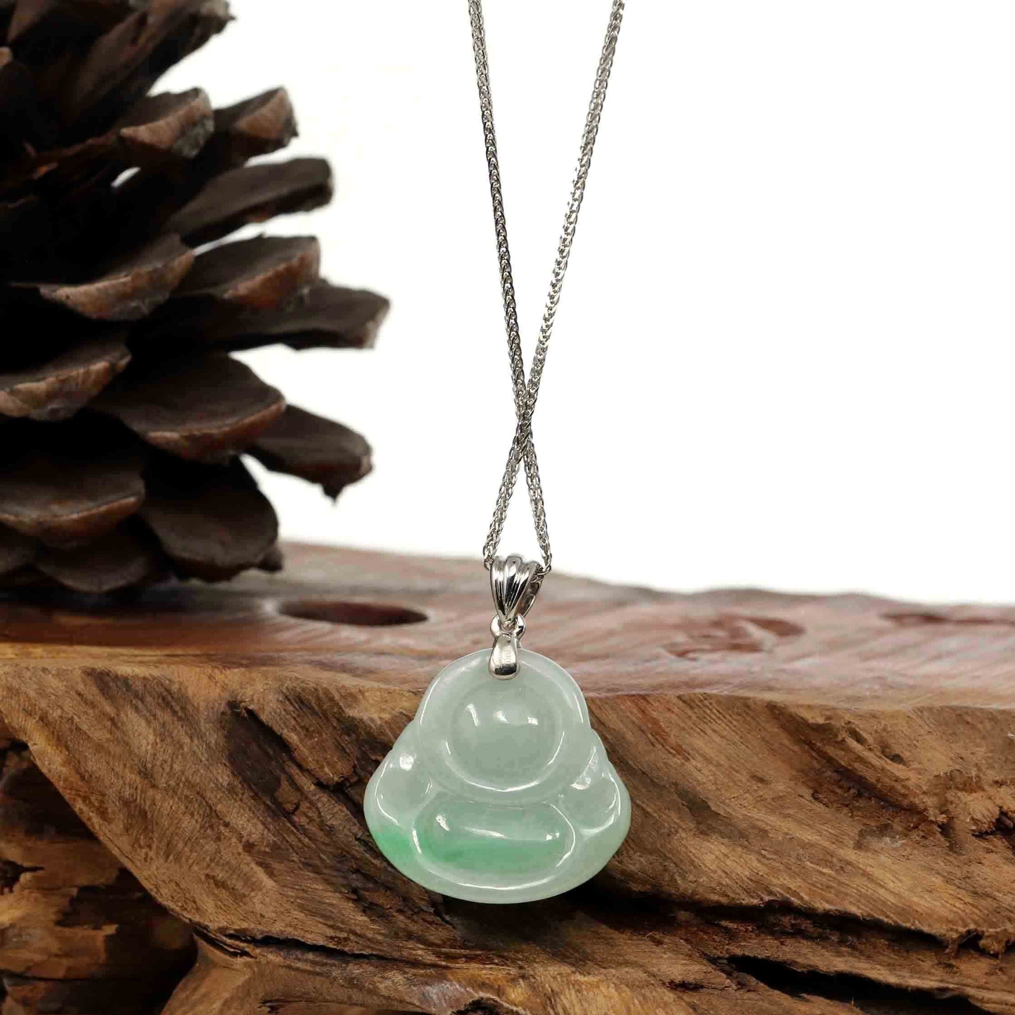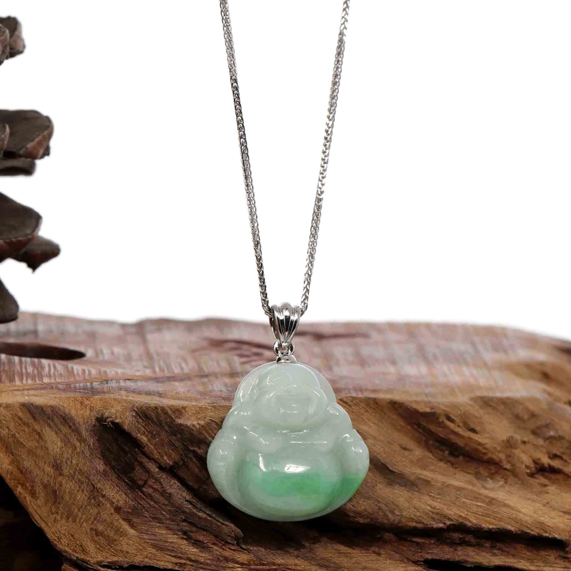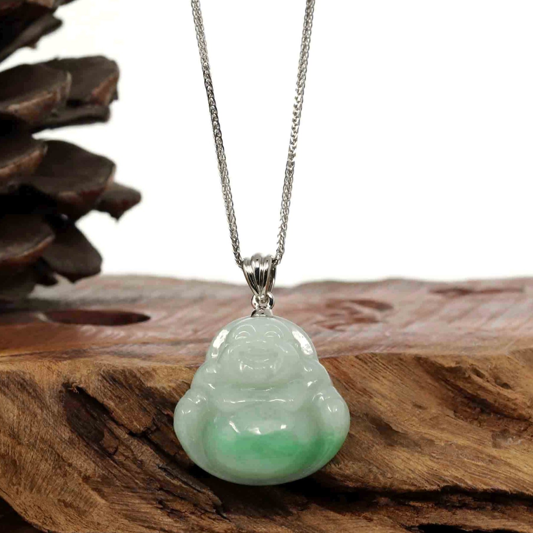 "Laughing Buddha" Genuine Vibrant Green Jadeite Buddha Pendant Necklace With Sterling Silver Bail