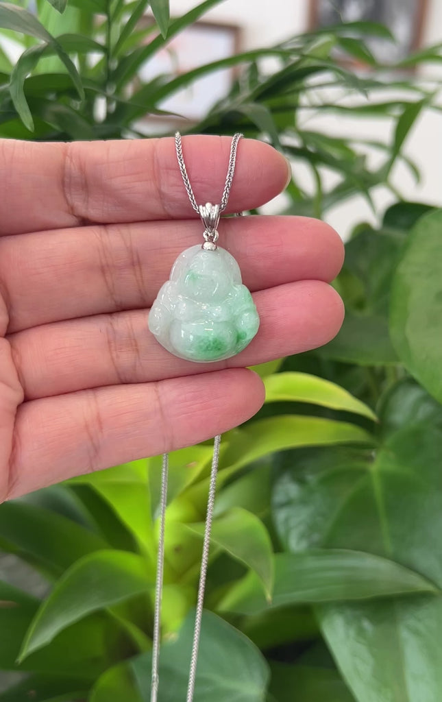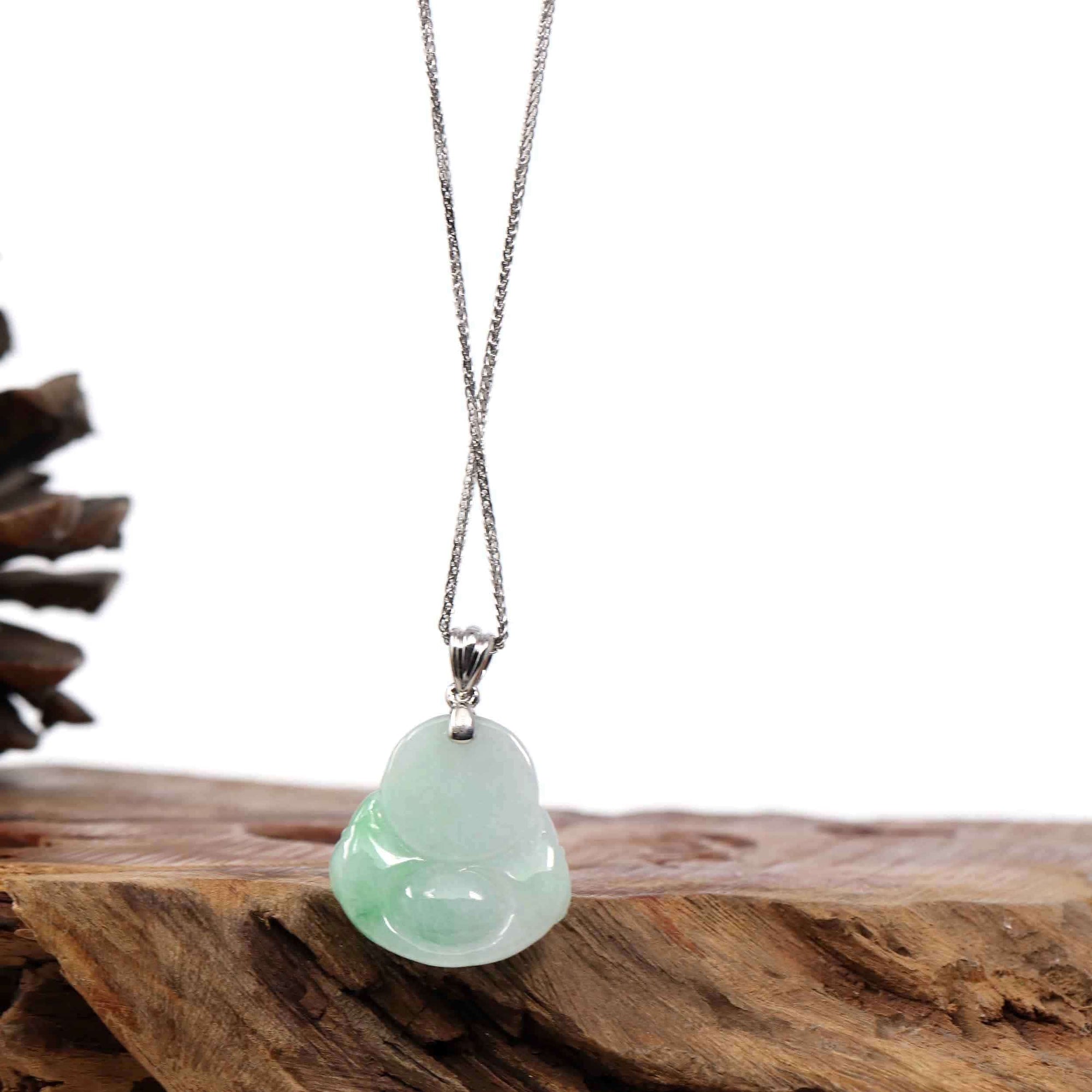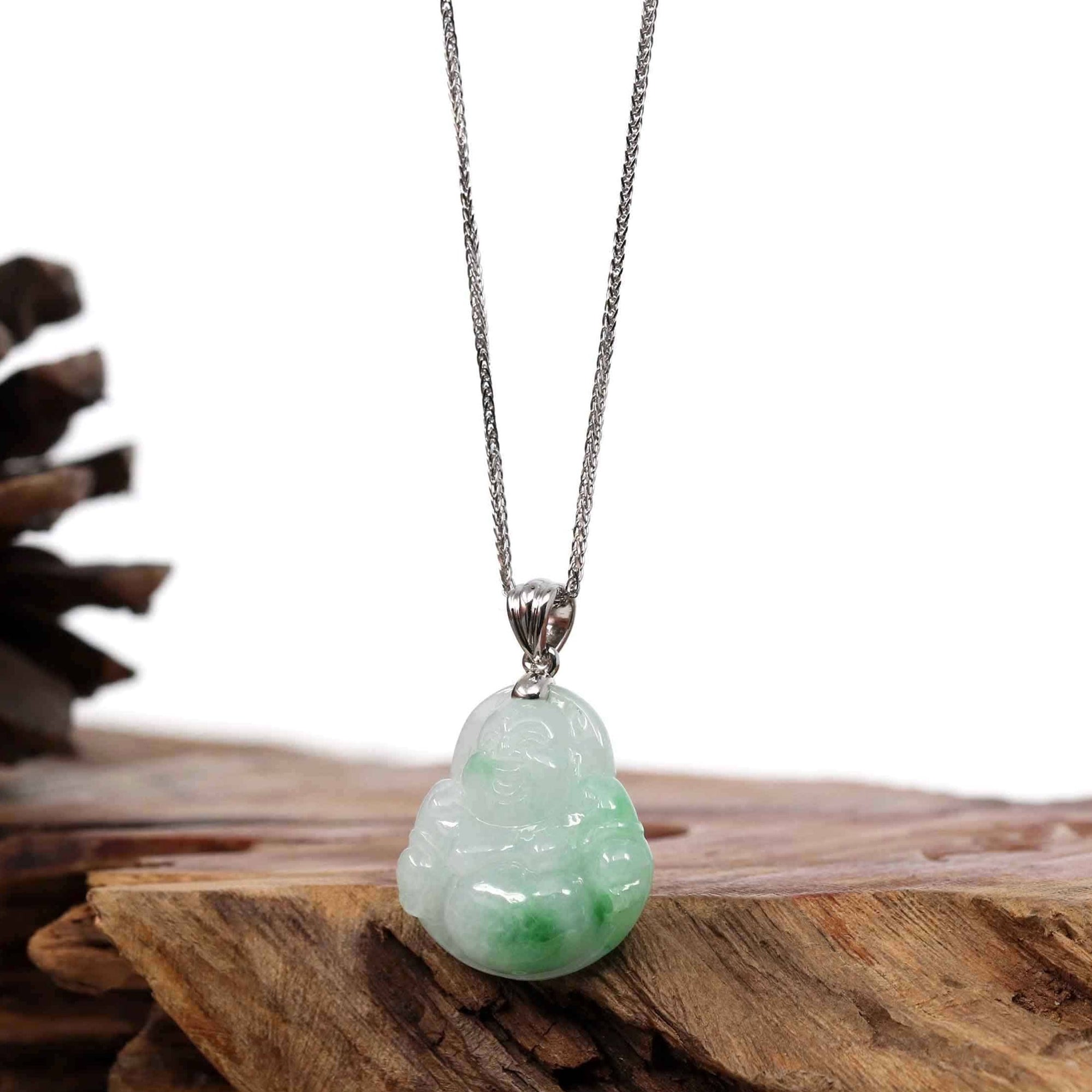 "Laughing Buddha" Genuine Vibrant Green Jadeite Buddha Pendant Necklace With Sterling Silver Bail
