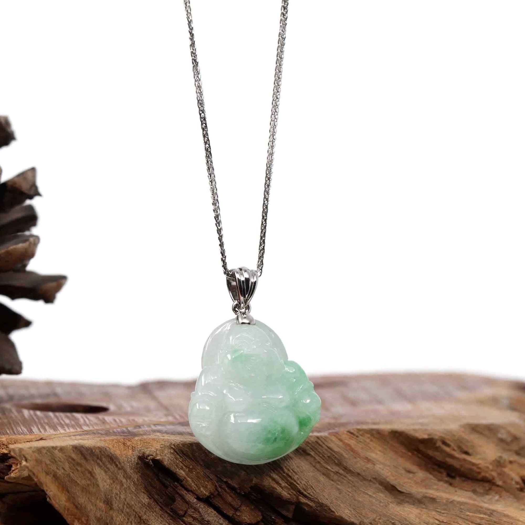 * Detail--- One-of-a-kind jadeite Buddha necklace, inspired by the figure of the traditional Buddha body. Combined with a modern bail. The piece is more than perfect for daily wear. Wearing items bearing the image of Buddha can remind us to be like Buddha in our daily life. Such items may also encourage us to be more patient in approach, kind in nature, and cultivate thoughts of peace and non-violence. Made with 100% genuine jadeite jade, untreated. Jadeite represents good luck, prosperity, and wealth. Handcrafted, with a lot of attention to detail.