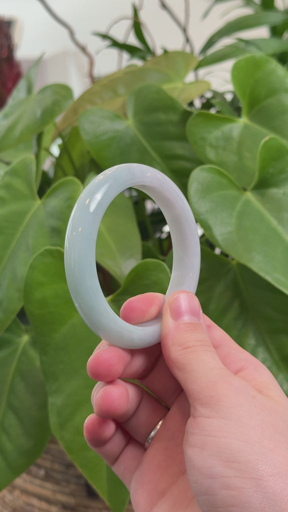 * DETAILS---This stunning jade bangle is crafted from fine Burmese jadeite with a beautiful clean blue green hue. Its smooth texture and timeless elegance make it a true standout. The classic half-round shape ensures a comfortable fit while showcasing the natural beauty of the jade. With its classic look, the natural jade bangle is not just a piece of fine jewelry, but also a meaningful gift — perfect for yourself or someone special.