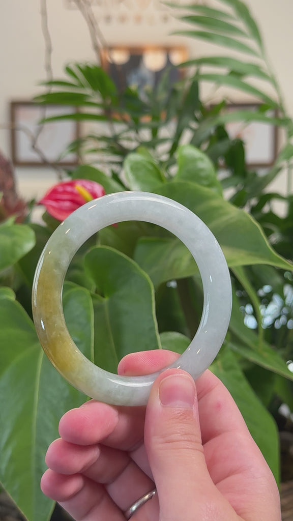 * DETAILS--- This bangle is crafted from genuine Burmese Jadeite jade. It features a smooth, translucent Icy texture with a oil green and yellow color that looks absolutely beautiful. With some natural lines within the bangle. Its classic, traditional round design is perfect for those who appreciate timeless style. Known for its durability, jadeite is also believed to bring good luck. This bangle makes a thoughtful and meaningful gift for yourself or someone special.