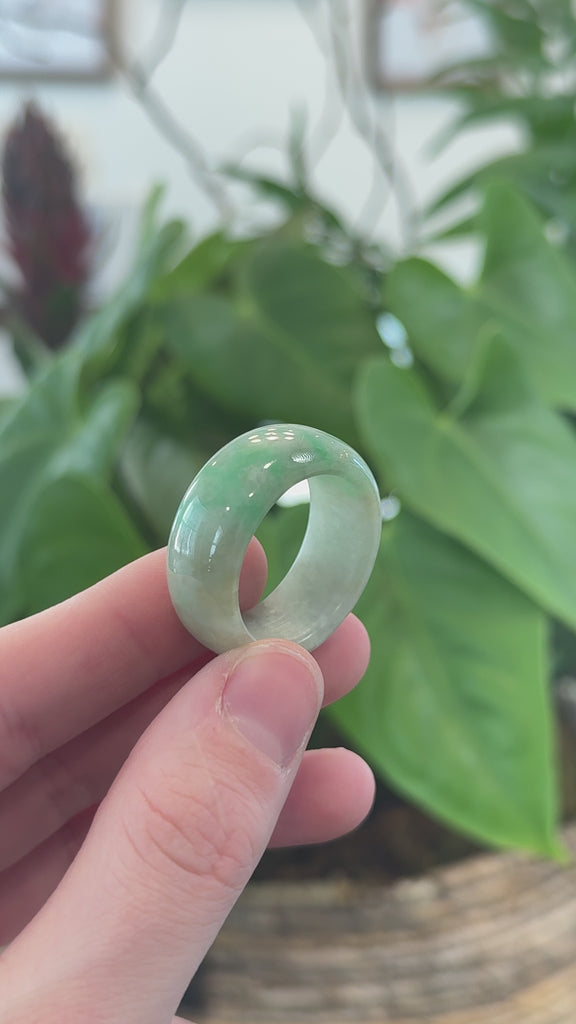 * DETAILS--- This ring is crafted from high-quality genuine Burmese green jadeite jade. It has a smooth, clean, and translucent texture, with a beautiful mix of vibrant apple-green and a faint yellowish green. This ring is wider in width than standard, creating a bolder look. Known for its durability, jadeite is also believed to bring good luck. This ring makes a thoughtful and meaningful gift for yourself or someone special.