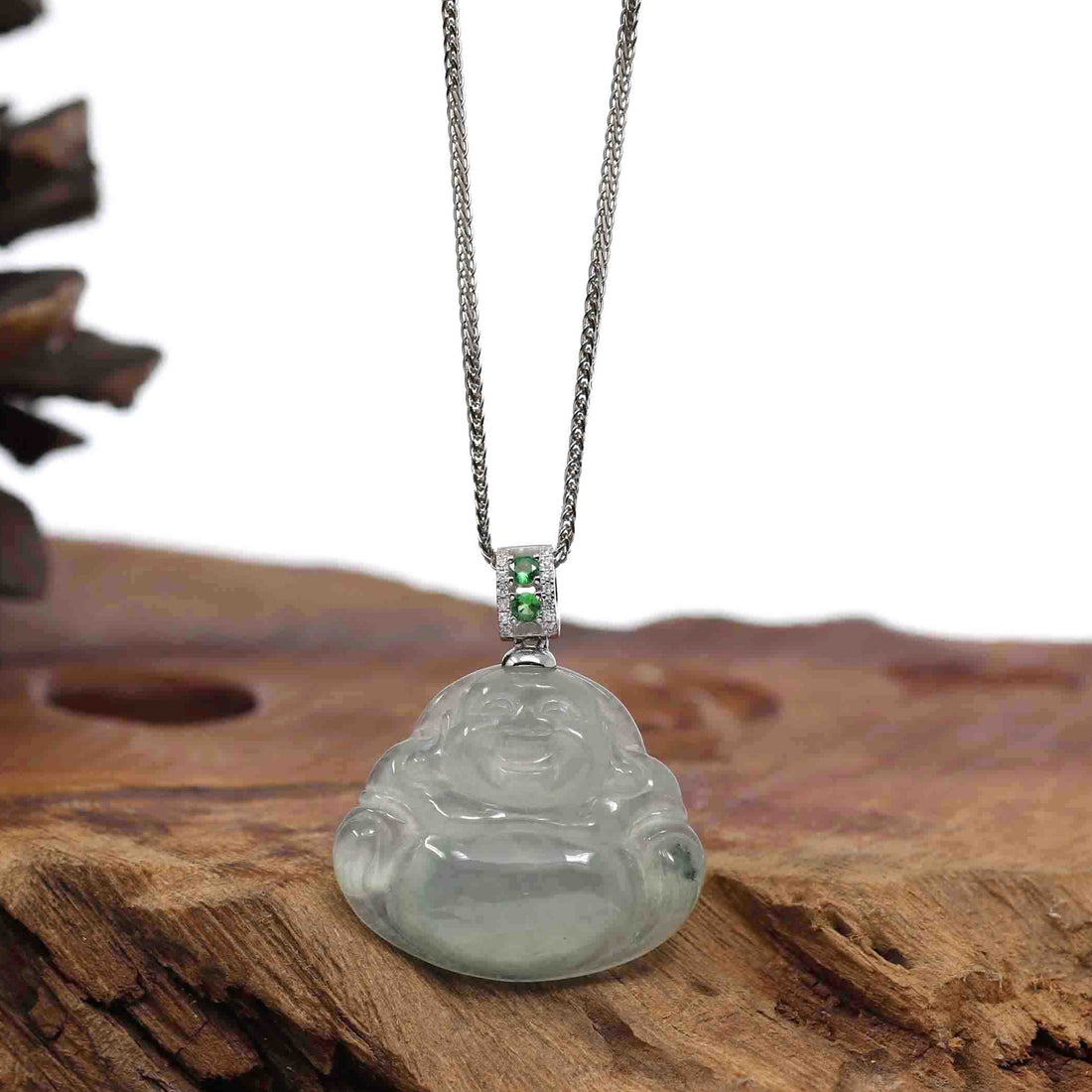 * Detail--- One-of-a-kind jadeite Buddha necklace, inspired by the figure of the traditional Buddha body. Combined with a modern AAA tsavorite bail. The piece is more than perfect for daily wear. Wearing items bearing the image of Buddha can remind us to be like Buddha in our daily life. Such items may also encourage us to be more patient in approach, kind in nature, and cultivate thoughts of peace and non-violence. Made with 100% genuine jadeite jade, untreated. Jadeite represents good luck, prosperity, and wealth. Handcrafted, with a lot of attention to detail.