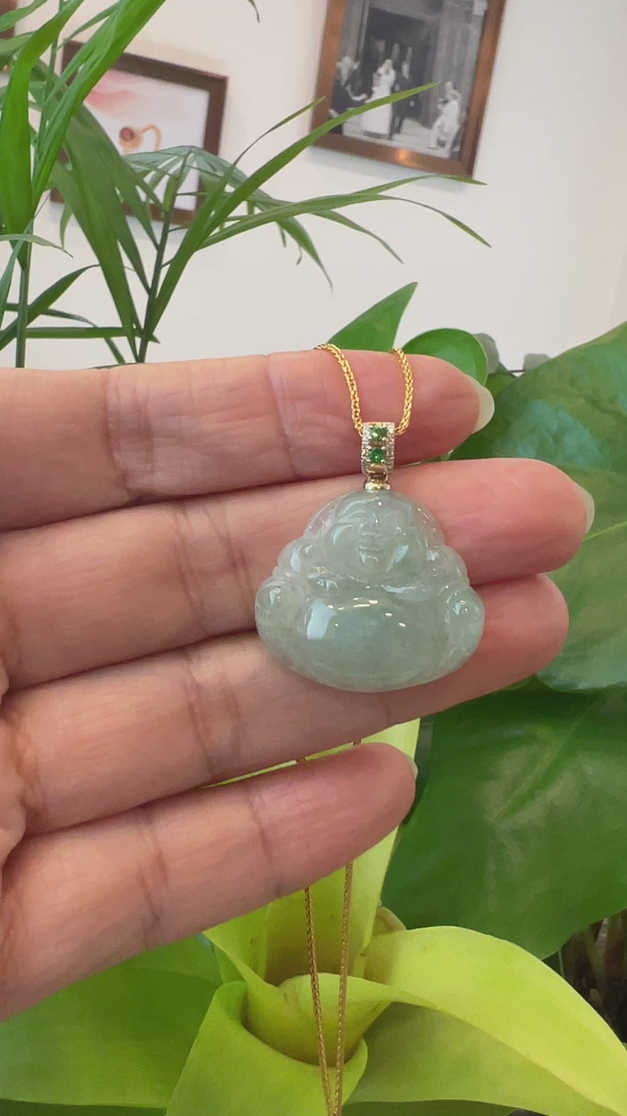 Natural Burmese Jadeite Jade Happy Buddha With 14k Yellow Gold AA Emerald Bail